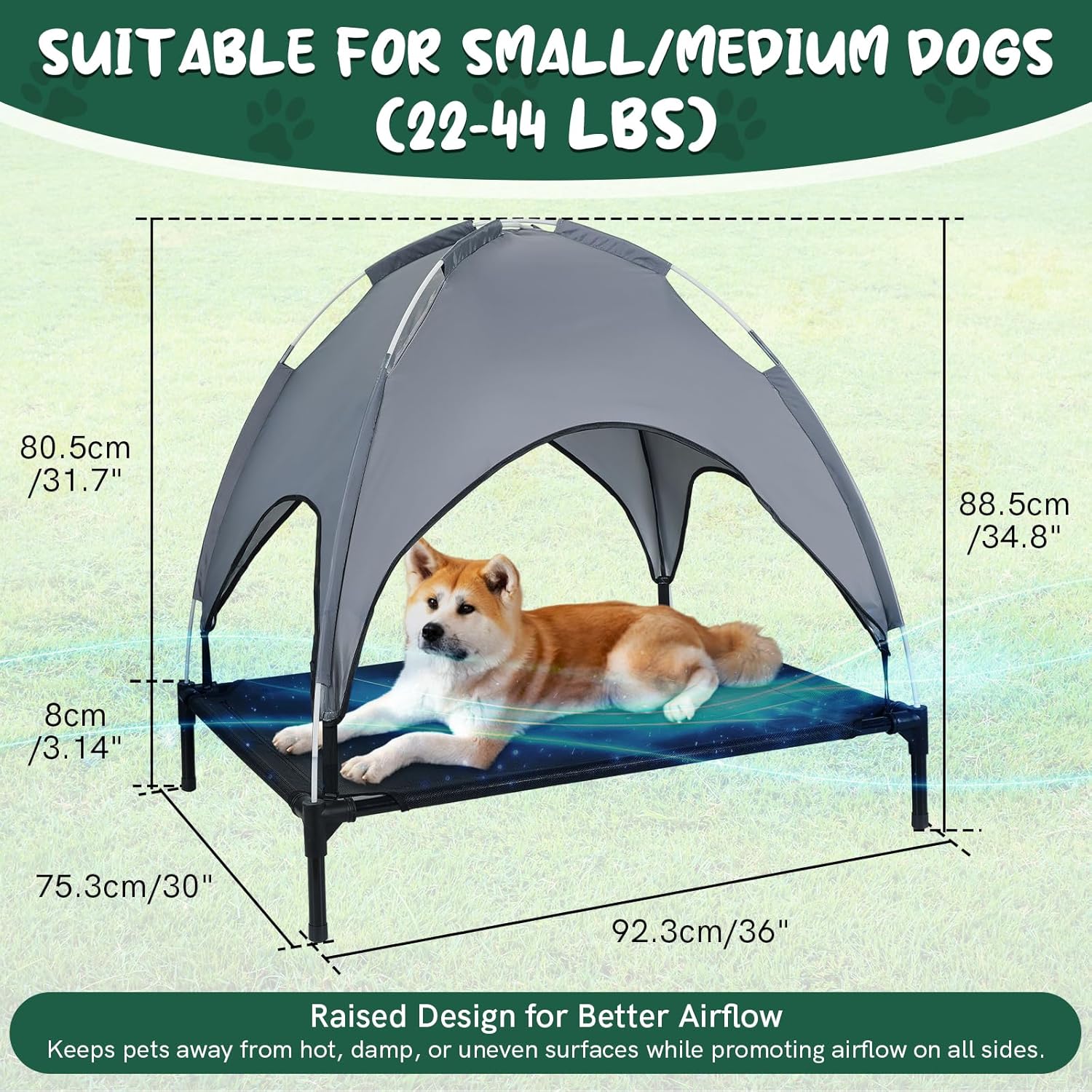 Specification: The elevated dog bed measures 36”L x 30”W x 3.14”H, and the canopy is 31 inches high.Package includes 1 elevated dog bed, 1 removable canopy, 1 storage bag, and all essential hardware for quick assembly—everything you need in one box.