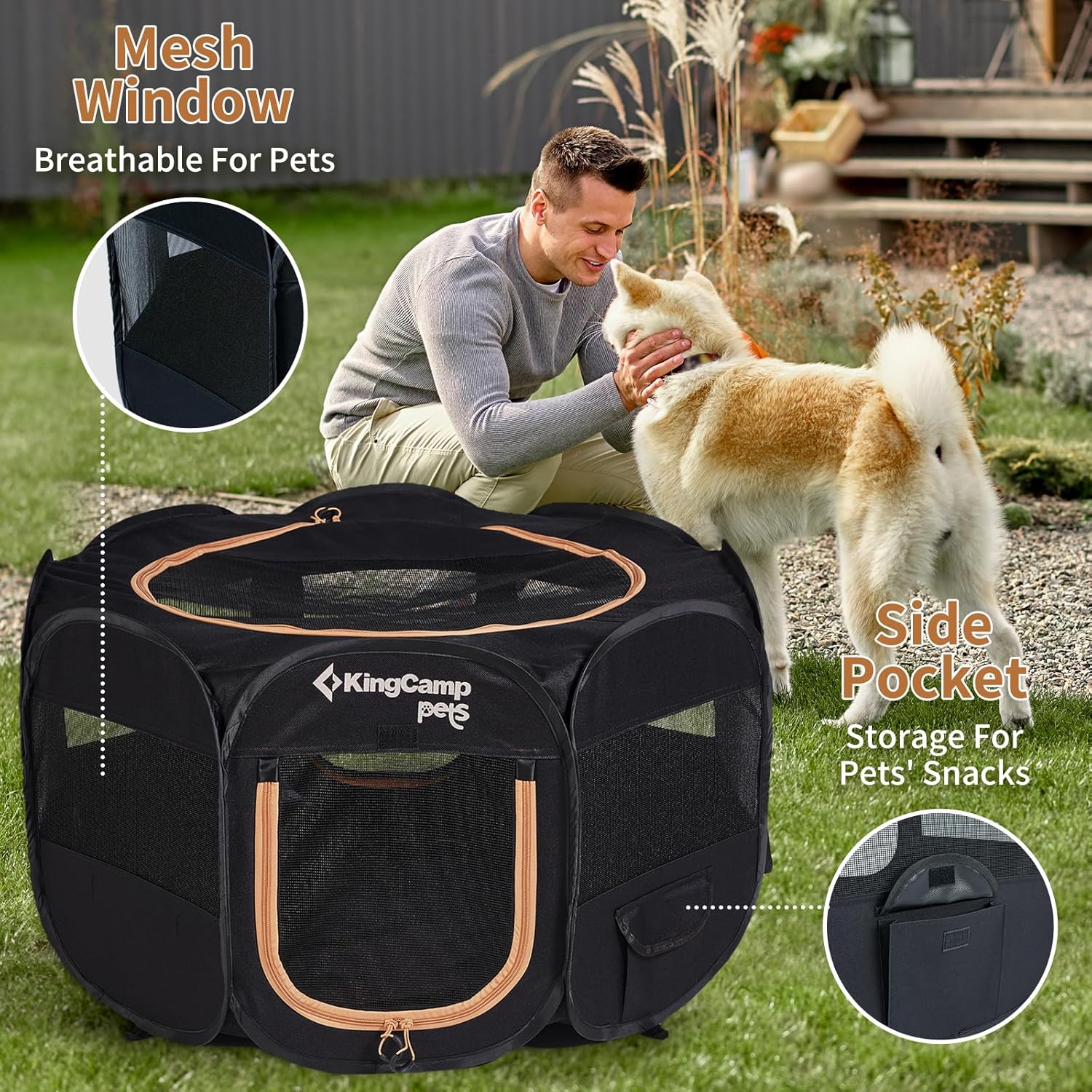 QUICK POP-UP DESIGN & PORTABLE CARRYING CASE: Without tools, the portable dog playpen outdoor opens in seconds thanks to a pop-up frame and self-tie elastic bands. When playtime’s over, pet playpen folds flat into a compact zippered storage bag, making it a breeze to carry for camping trips, beach days, RV adventures, or weekend getaways with your pet.