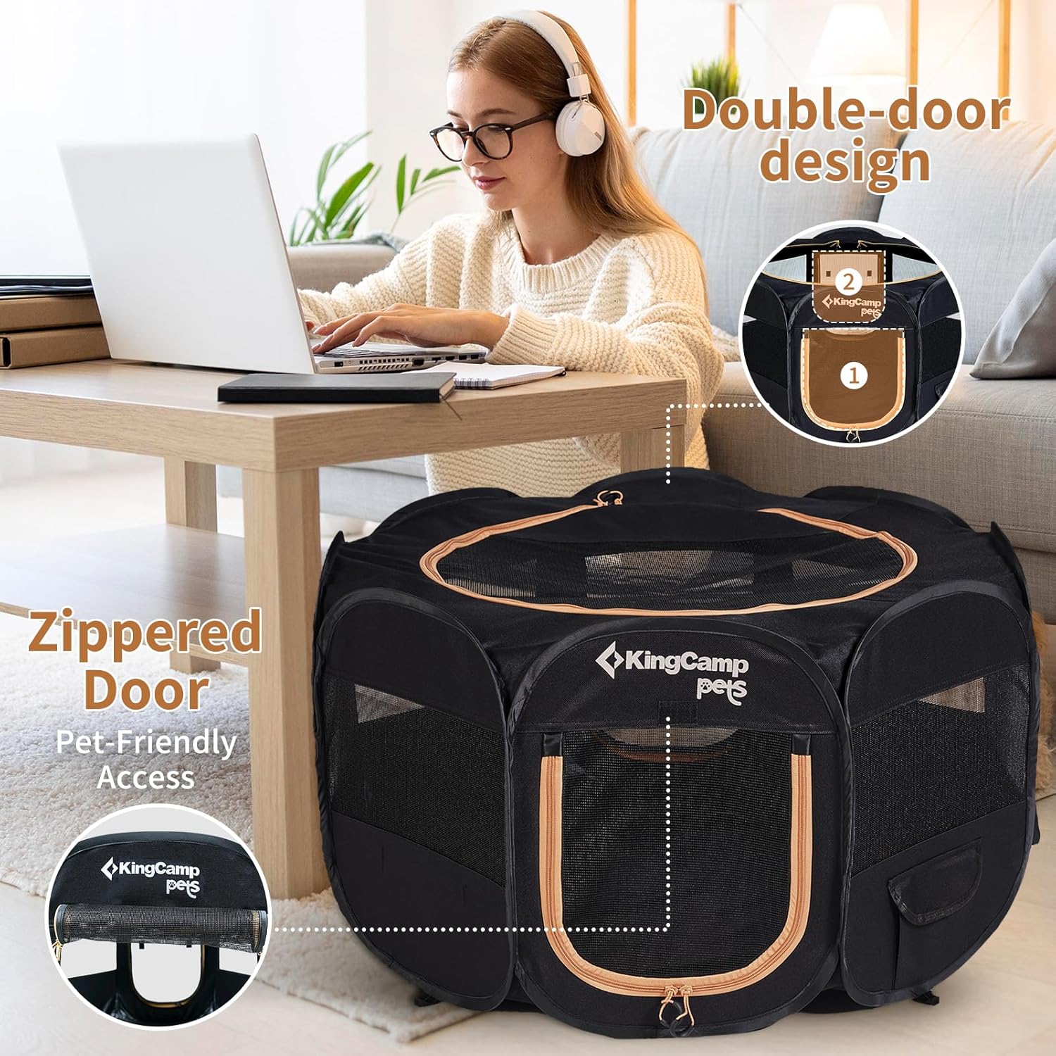 FULL VENTILATION & SMART ACCESS: Two zippered doors (front & back) provide pets easy entry and exit, while breathable mesh panels on the sides and top ensure 360° airflow and sunlight. The top of pop up playpen can also be zipped open for direct interaction, ideal for bonding moments without unzipping the entire structure.