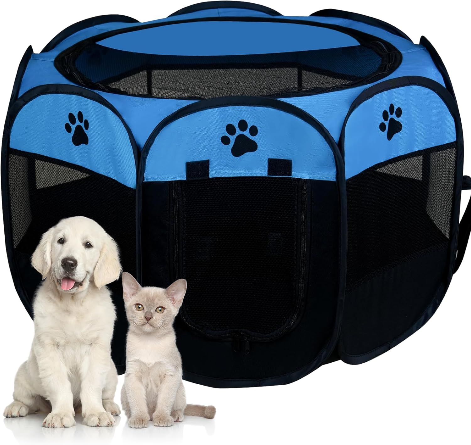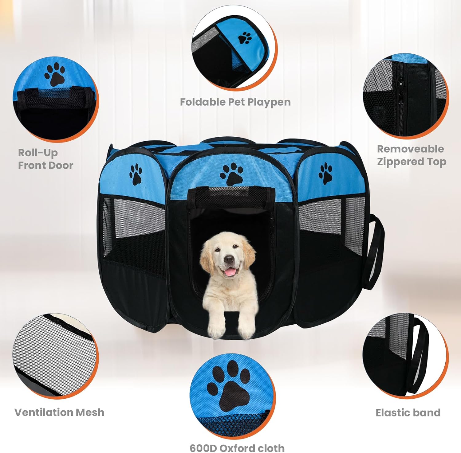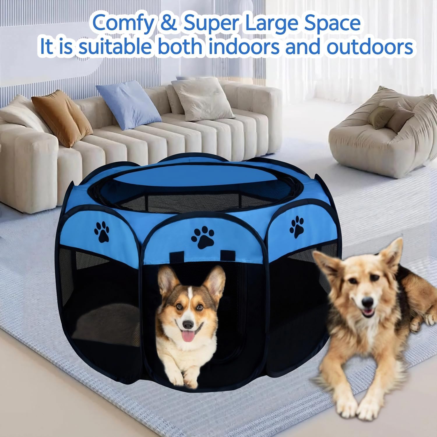 【Safe and High-Quality Materials】 Made from premium thick mesh and 600D Oxford cloth, this pet playpen indoor is durable and waterproof. Reinforced seams and corners make it resistant to pet damage. The pop up playpen features 8 mesh side panels and a semi-mesh top for excellent ventilation. You can easily monitor your pet with 360-degree visibility, while your pet enjoys a panoramic view of their surroundings.