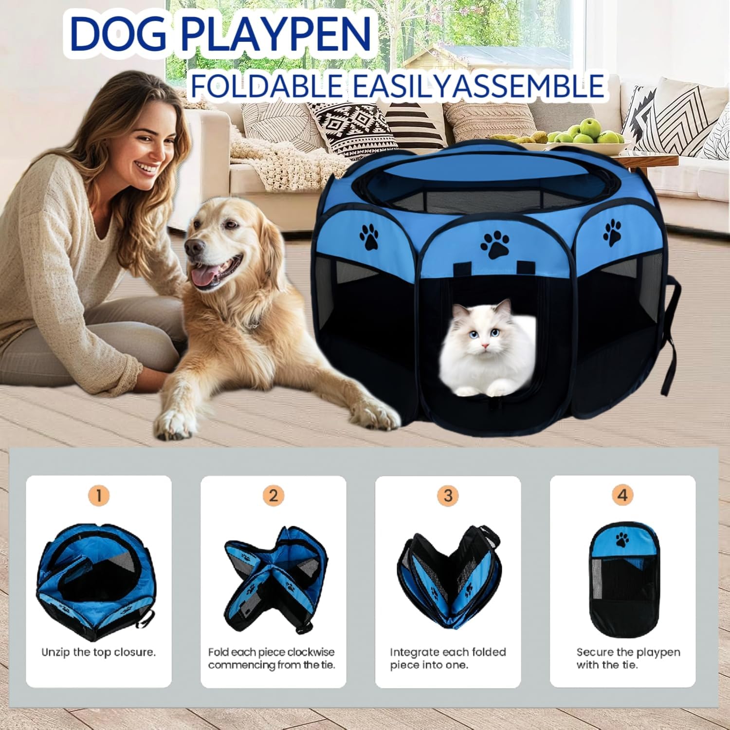 This portable pet playpen offers a comfortable and spacious environment, suitable for both indoors and outdoors.The top design zipper easy for open and close the top for more ventilation indoor or outdoor.