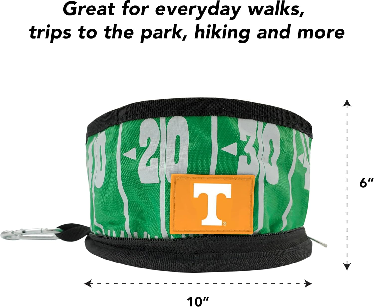 This Premium Travel Dog or Cat Bowl isn’t just adorned with your favorite COLLEGE team, it is also designed to show a green football field themed with the lines & numbers when you unzip the bowl. Wow!