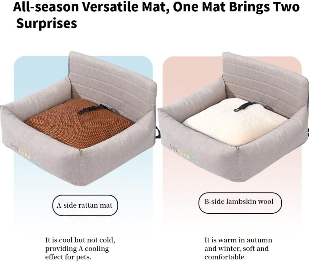 DUAL-SIDED CUSHION: Reversible cushion with cooling mesh for summer and plush material for winter, dog car seat portable, allowing year-round temperature comfort for your pet.The A-side rattan mat is suitable for summer. It is cool but not cold, providing A cooling effect for pets.Anti-escape clip pet safety belt design.Linen fabric,scratch-resistant, wear-resistant and easy to clean