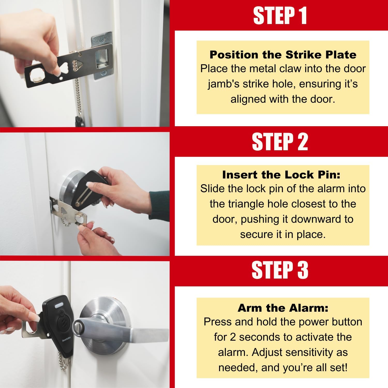 (Fits Most Swinging Doors): Built with a dual-claw strike plate, the portable travel door lock fits most standard doors, deadbolts, and commercial doors, making it a versatile and effective security solution.