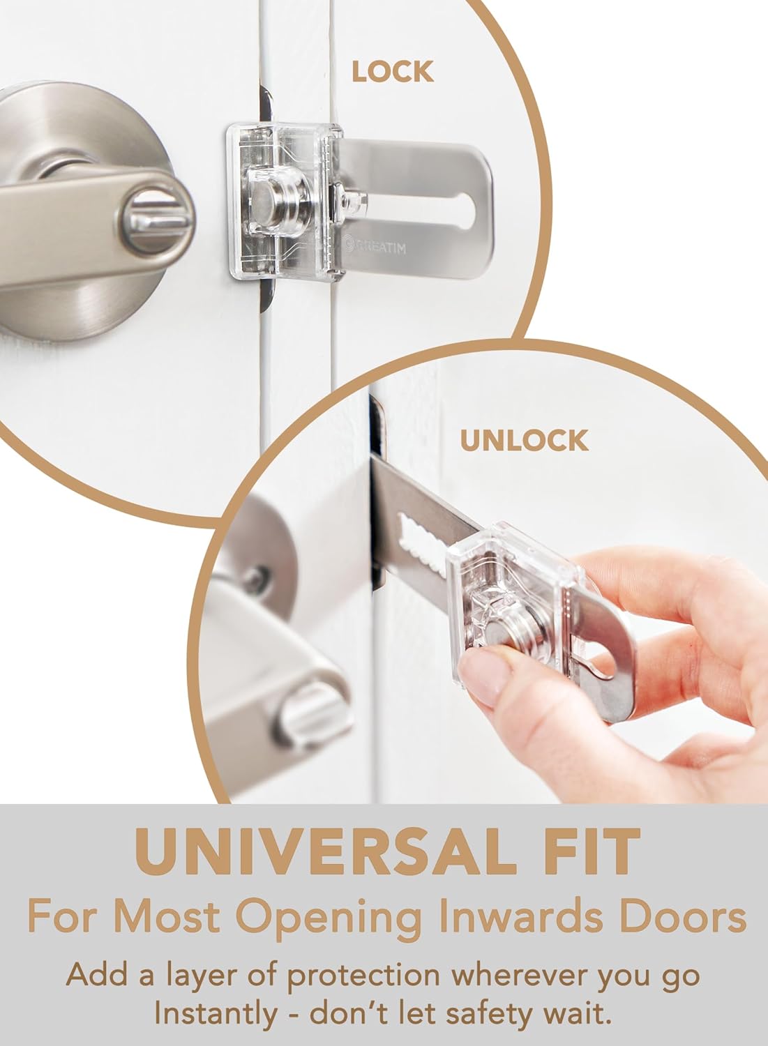 Easy, One-Handed Setup: Slip it into the latch for fast, one-handed installation. Add a layer of protection wherever you go, instantly—don’t let safety wait. We designed the door lock so that its setup is easy and accessible for everyone.