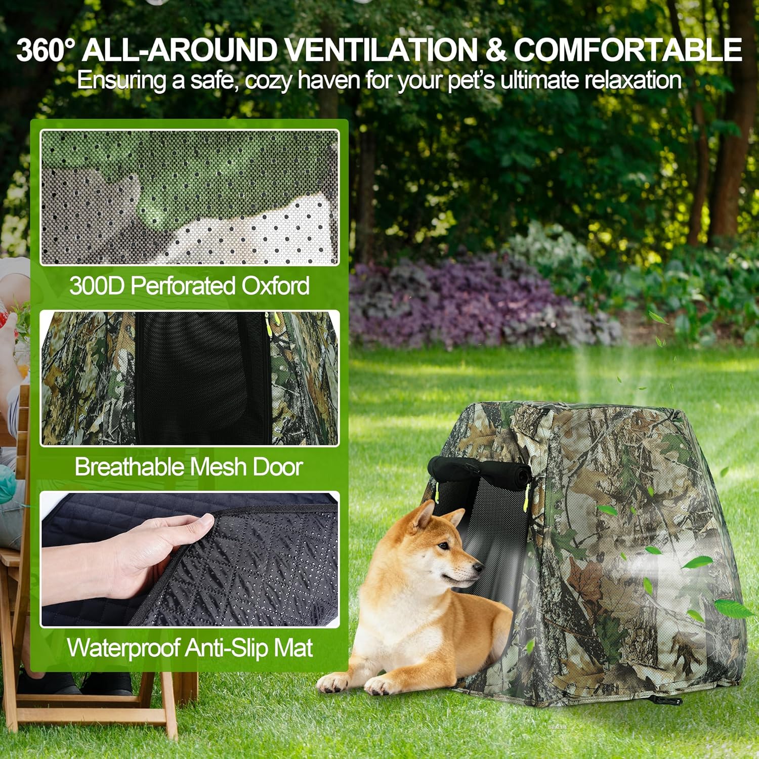 Pet-Friendly Design: The pet tents features high-density breathable mesh on all sides, creating 360-degree airflow circulation to keep your pet cool and comfortable. The foldable dog tent one-way visual camouflage fabric provides privacy by blocking outside views while allowing your pet to observe its surroundings, enhancing their sense of security. Inside the dog beach tent, a soft anti-slip mat is included to prevent slipping and ensure your pet’s stability and comfort during use.