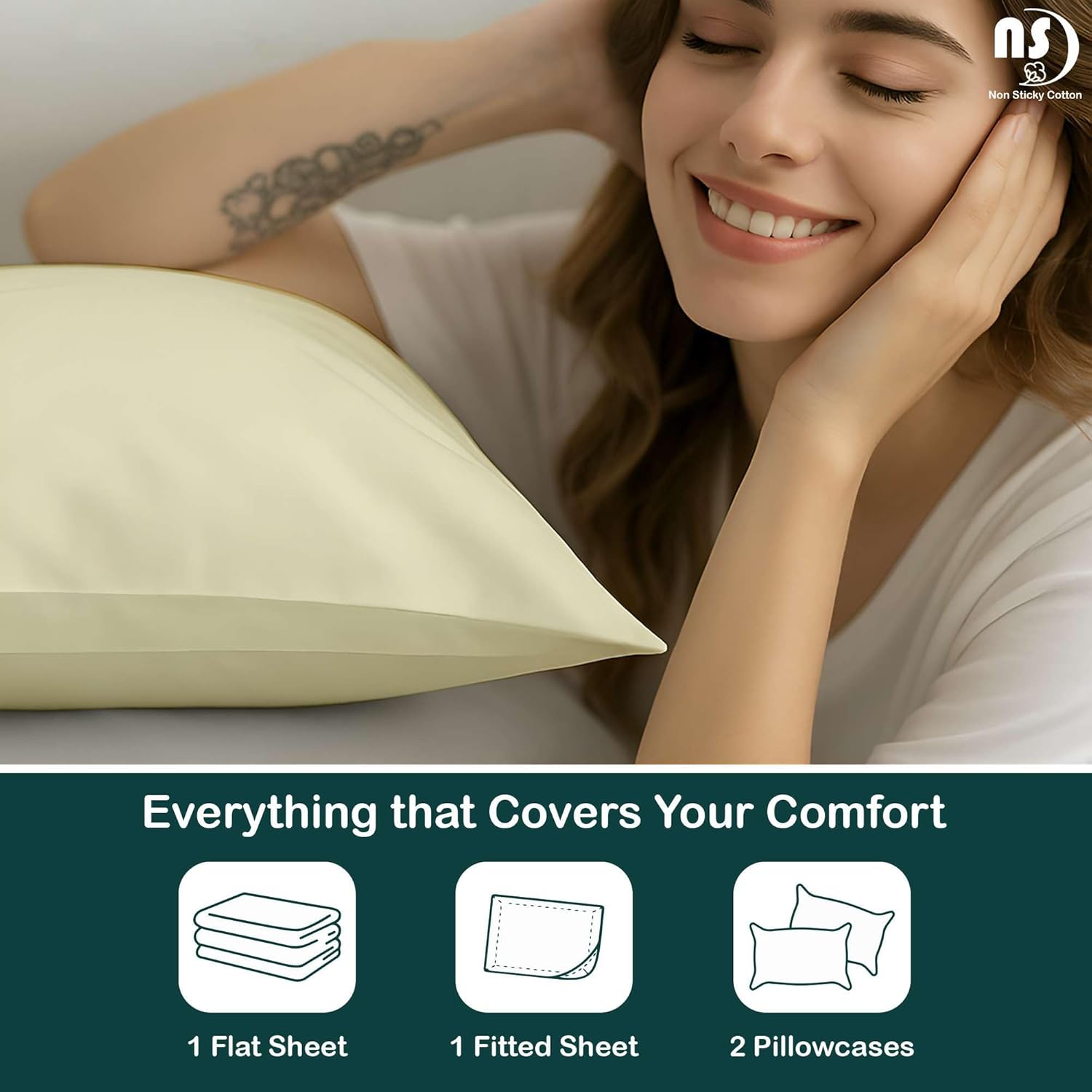 Complete 4-Piece Set: Includes 1 flat sheet (90″ x 102″), 1 fitted sheet (60″ x 75″) with deep 15″ pockets, and 2 pillowcases (20″ x 30″). The fitted sheet is fully elasticized for a snug, no-slip fit on thick mattresses.