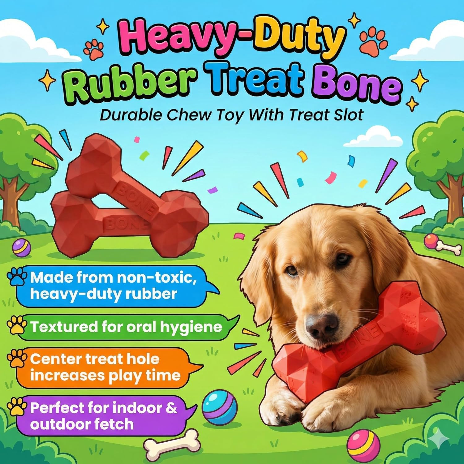 RUBBER BONE: A durable, non-toxic rubber dog bone that withstands chewing while being gentle on teeth. Textured for cleaning, lightweight for fetch, and features a treat-holding center for extra engagement and mental stimulation.