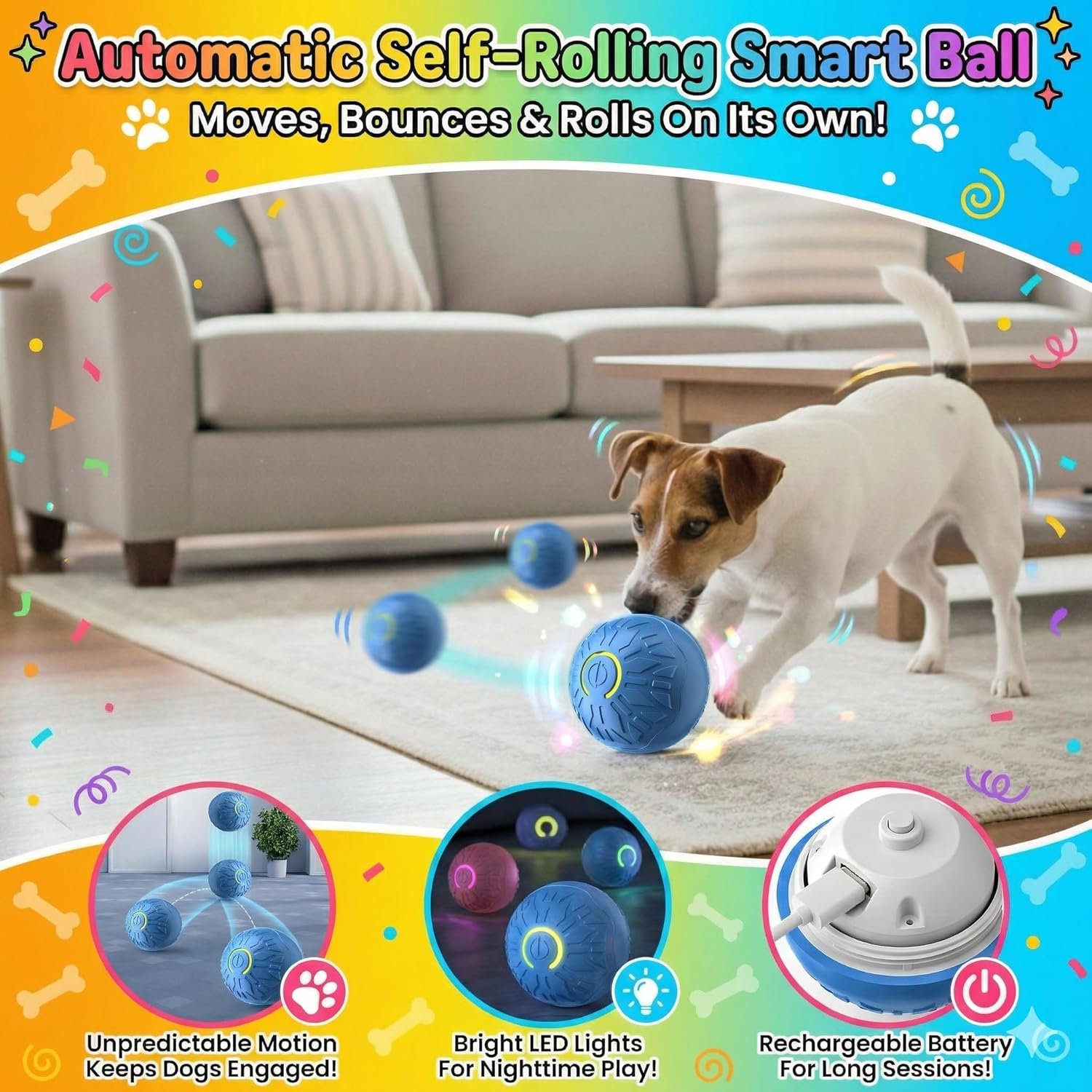 SELF-ROLLING RUBBER BALL: An interactive smart dog toy that rolls, bounces, and jumps on its own to keep dogs active and engaged. Features bright LED lights for easy chasing day or night, durable pet-safe materials, and a rechargeable battery—perfect for indoor and outdoor play.