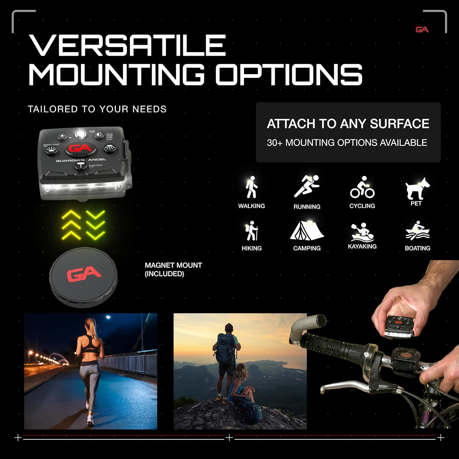 𝗠𝗮𝘅𝗶𝗺𝘂𝗺 𝗩𝗶𝘀𝗶𝗯𝗶𝗹𝗶𝘁𝘆: With 13 high-output LEDs, the Guardian Angel Micro Series keeps you visible from up to 3+ miles. With 360° lighting, others can see you from all sides. Four brightness settings, multiple flash patterns, steady burn option and Emergency Mode, ensure others can see you when needed. With 6 white LEDs on the front, 6 red LEDs on the rear, this device features a hands-free white flood light, a white work light, and a white top light.