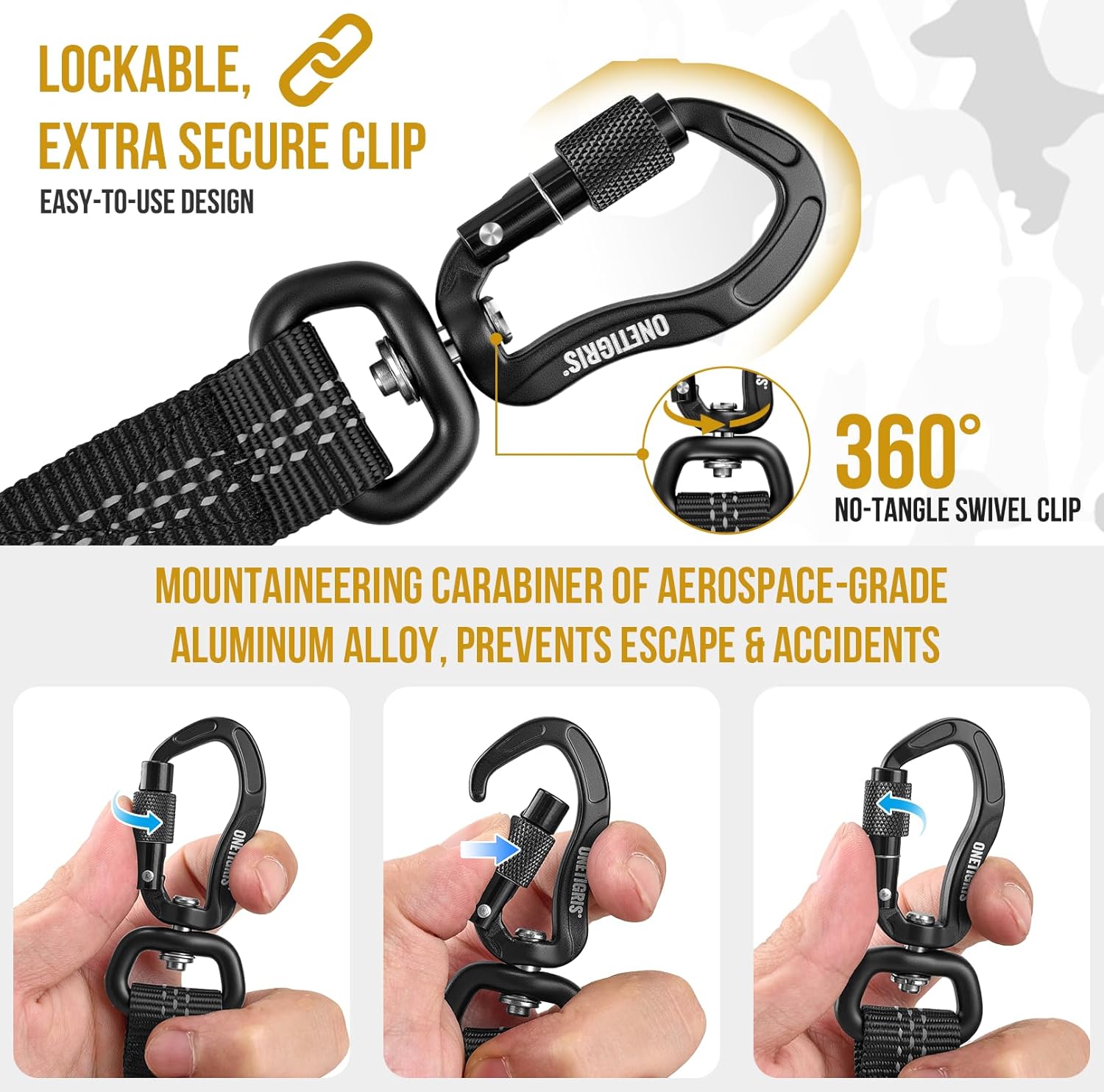 HI-VIS & SAFETY: Light-reflective threading for heightened visibility in low light conditions and to alert coming cars of you and your pup’s whereabouts; extra strong, mountaineering aluminum alloy carabiner prevents escape and accidents