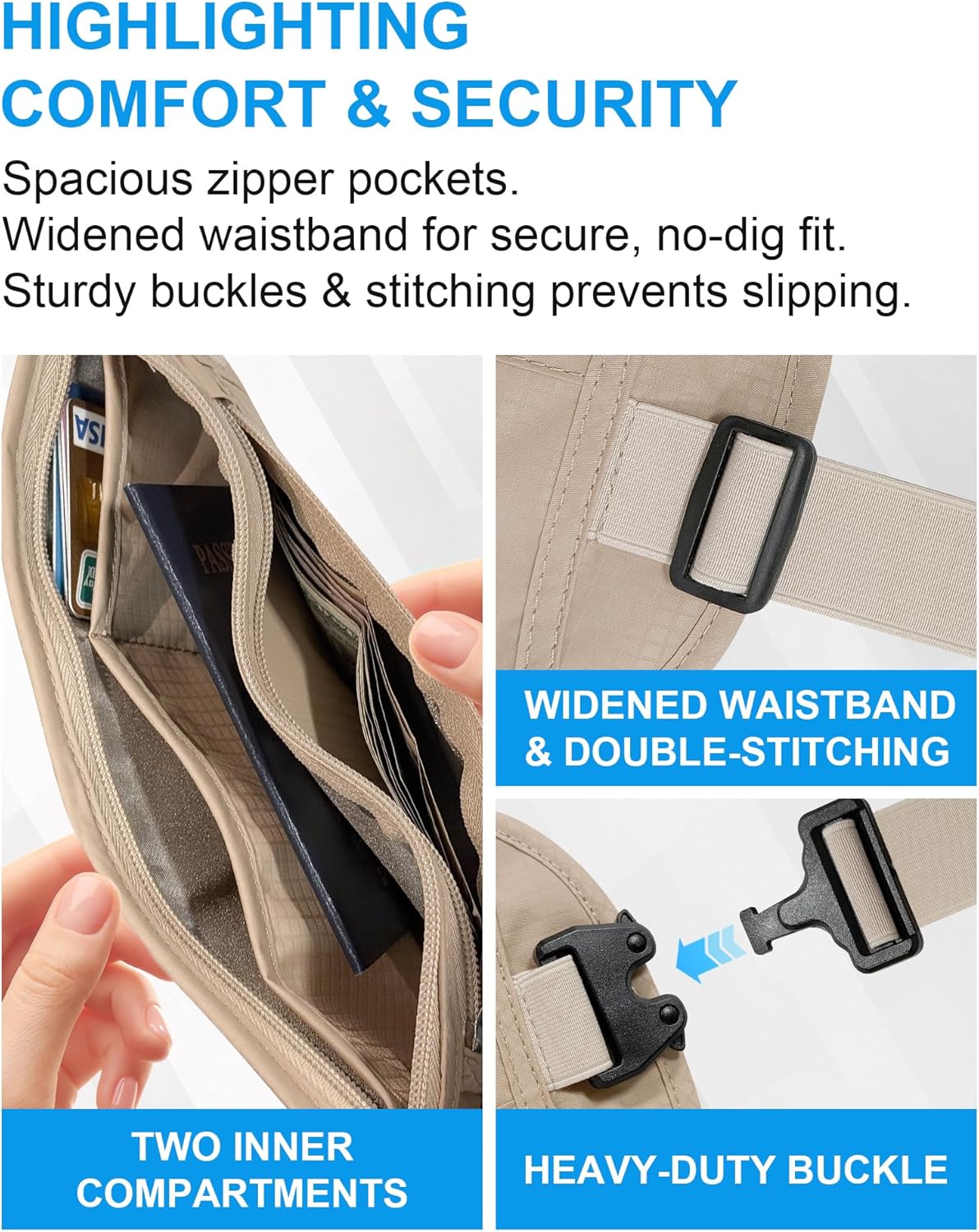 Smart & Secure Organization: Our travel money belt(11.2″ X 5.7″) has 2 main zippered pockets + hidden rear pocket organize phones, passports, cards and cash, keeping essentials protected and accessible