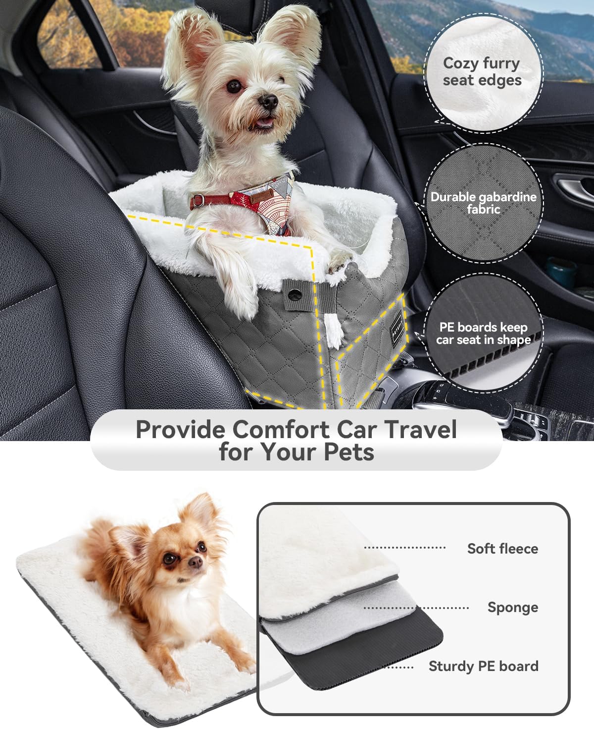 [Small dog car seat with a view] When you take a long car trip with your fur friend, it can lay down comfortably within your reach. Center console dog car seat could give your nervous or carsick dog a window view where it can look out and enjoy the trip. And increase the intimacy between the pet and you.