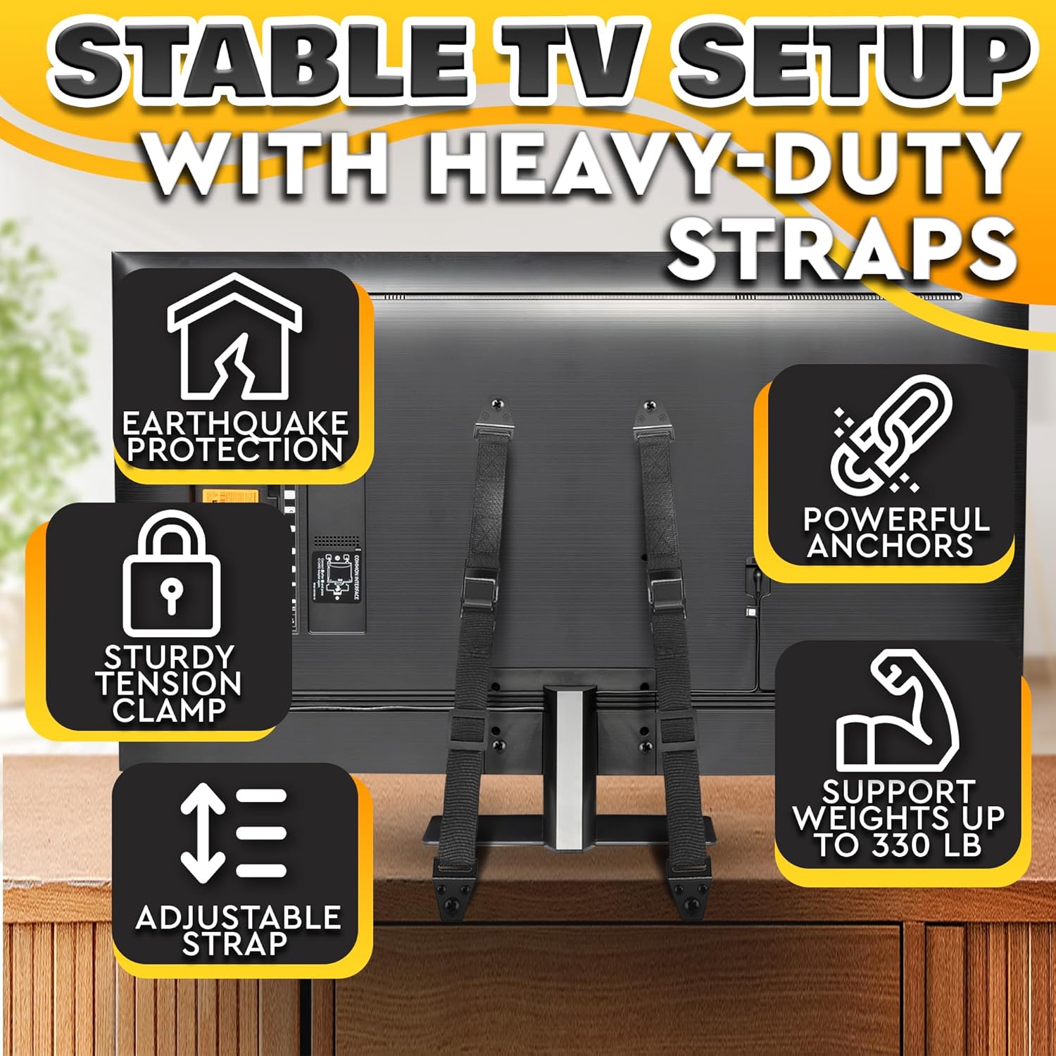 Durable Material: These TV anti tip straps are crafted from sturdy metal and durable nylon. TV anchor holds up weights up to 330 lbs – which is enough for any furniture in your home