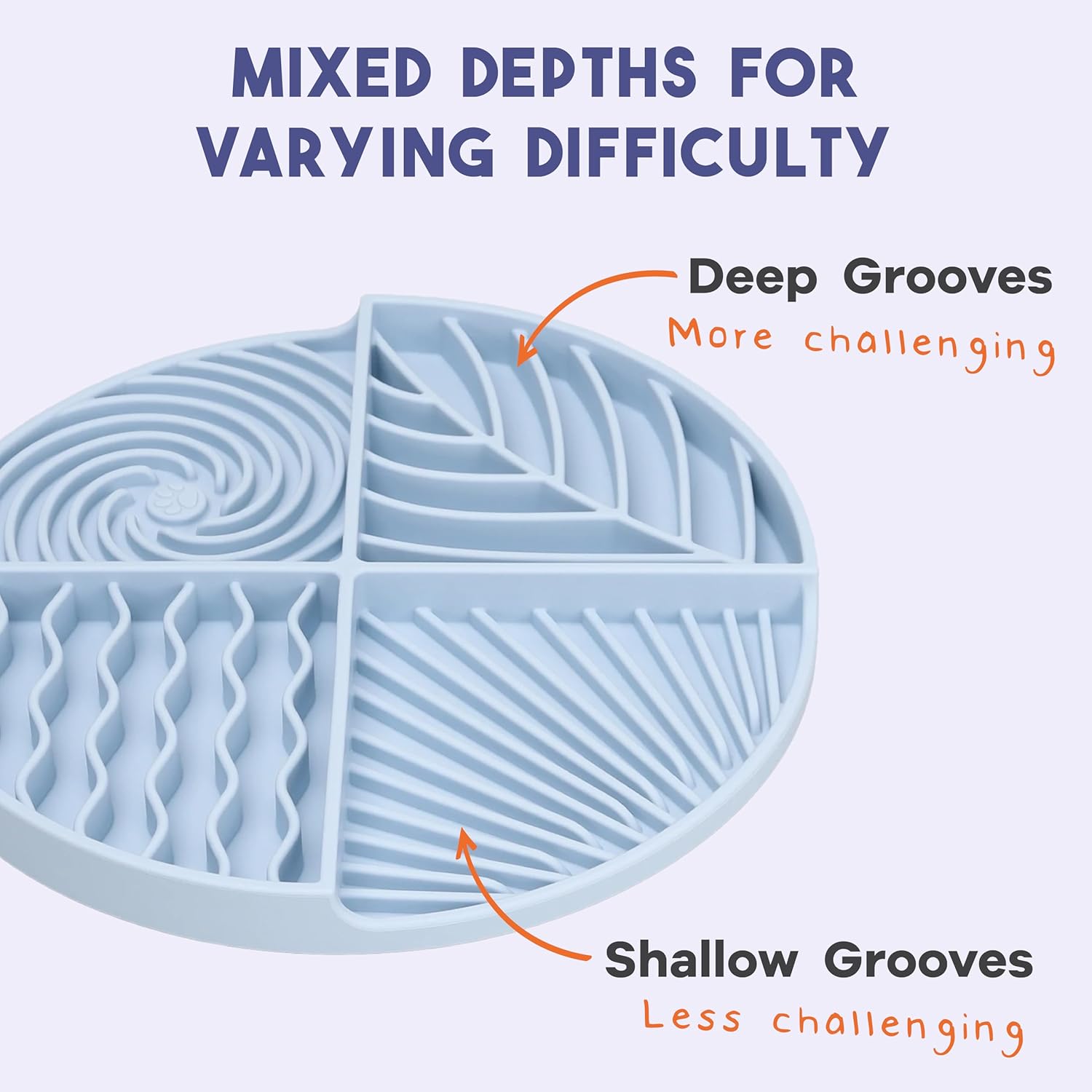 MIXED DEPTHS FOR VARYING DIFFICULTY – The deep grooves of this universal feeder mat offer greater challenge, while the shallow grooves provide easier access to everything from peanut butter to meats, fish, fruits, and veggies. Cats, kittens, dogs and puppies of all breeds and sizes will fall in love with the stimulation of the four textured sections!