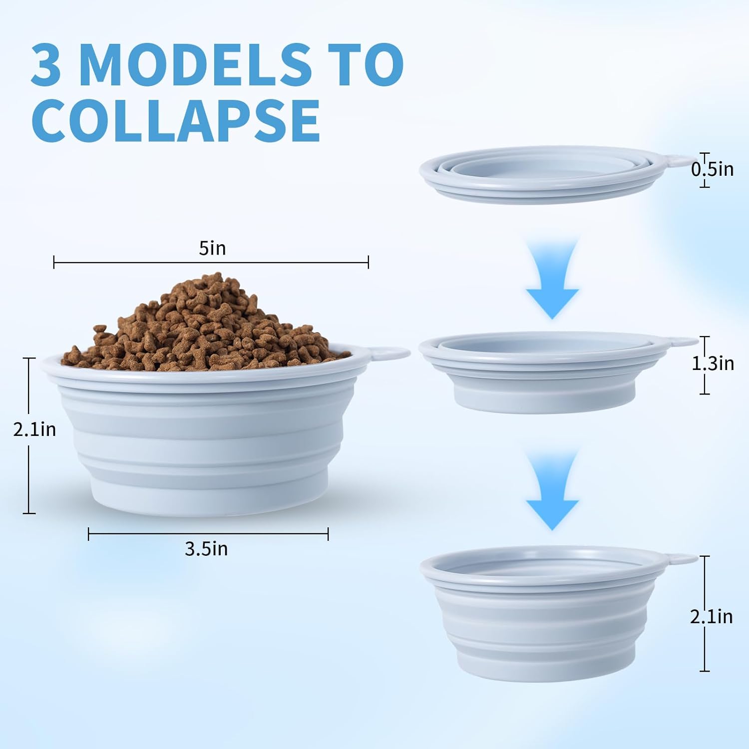 3 SIZE TO CHOOSE: Available in 3 different size S,M,L for small,medium,large breed dogs/cats. S: 5”x3.5”x2.1”(expanded), 0.5” height(folded), each bowl holds 12 oz of water or 1.5 cups of pet food. M: 6.3”x4.3”x2.4”(expanded), 0.7” height(folded),holds 22oz water or 2.8cups food. L: 6.8” x 4.9” x 2.9” (expanded), 0.7” height(folded), holds 34oz water or 4.2 cups food. Keep your furry friend hydrated and well-fed on the go with SLSON Collapsible Dog Travel Bowls.