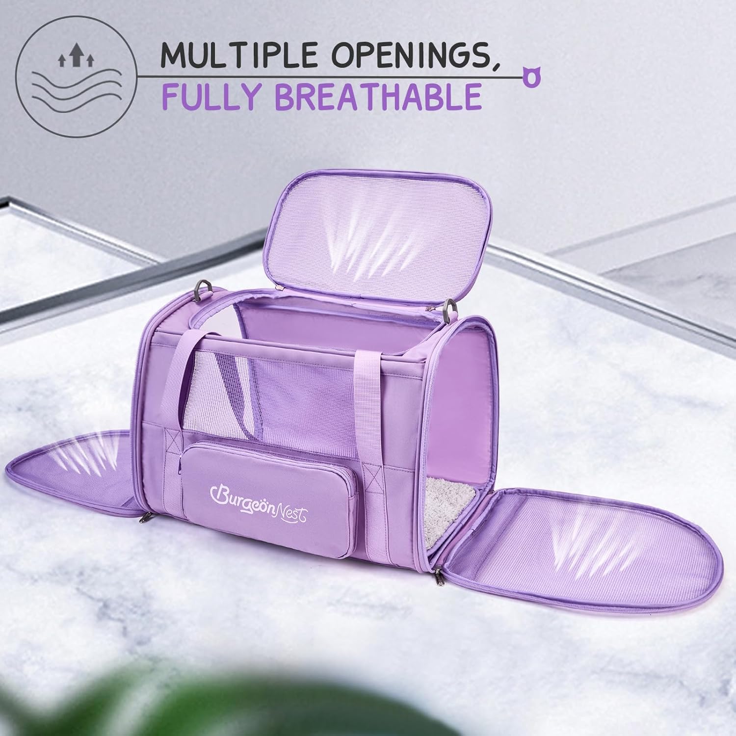 Well-made Large Cat Carrier: With upgraded memory metal for sturdy frame, this cat carrier for 2 cats does not collapse. Made of breathable fabric, BurgeonNest cat carrier has 3 doors to open, it is more convenient to put your dog cat in or out. Plush cushion with sturdy bottom inserts ensures comfortable environment for pets.