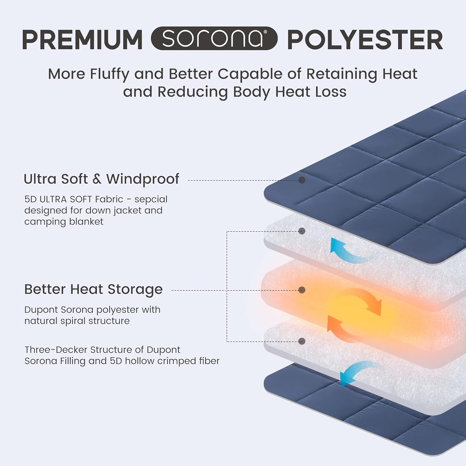 WARM AND COZY: A weather resistant blanket that’s warm and incredibly cozy. Our warm blanket is filled with premium Dupont Sorona polyester. Its spiral structure makes it more fluffy and better capable of retaining heat and reducing body heat loss. So whether you’re relaxing by the fire or sleeping under the stars, our blanket will keep you warm and toasty. You can also enjoy the same softness on the couch, in the backyard as well as at bedroom.