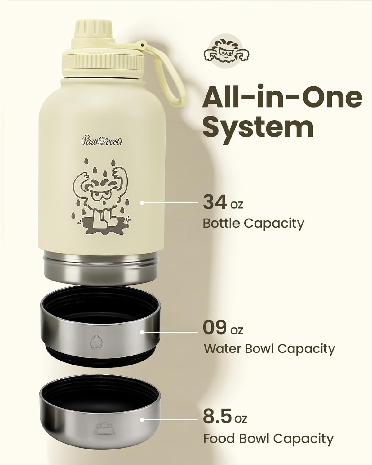 🧳 34oz Dog Water Bottle, Stainless Steel Dog Water Bottle Dispenser with Detachable Food & Water Bowls, Keeps Water Hot/Cold, for Walking, Hiking, Camping(Cream) — Dog Travel Gear Review & Current Price