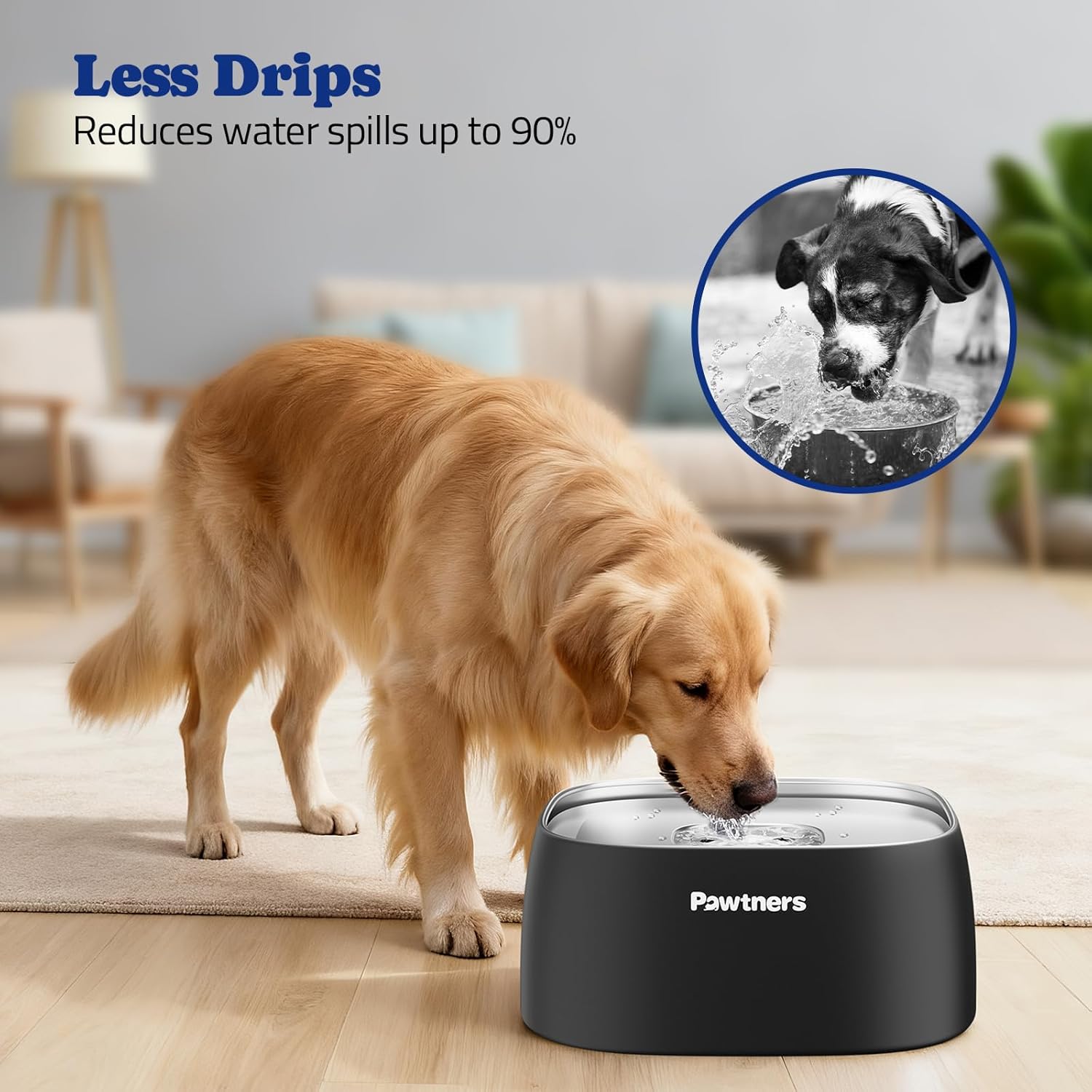 Spill-Proof & Anti-slip Design: This dog water bowl features an innovative floating disk that automatically adjusts the water level to prevent splashing. A non-slip bottom keeps the bowl from sliding or tipping during drinking. No more wet floors—just a clean, dry space for your dog