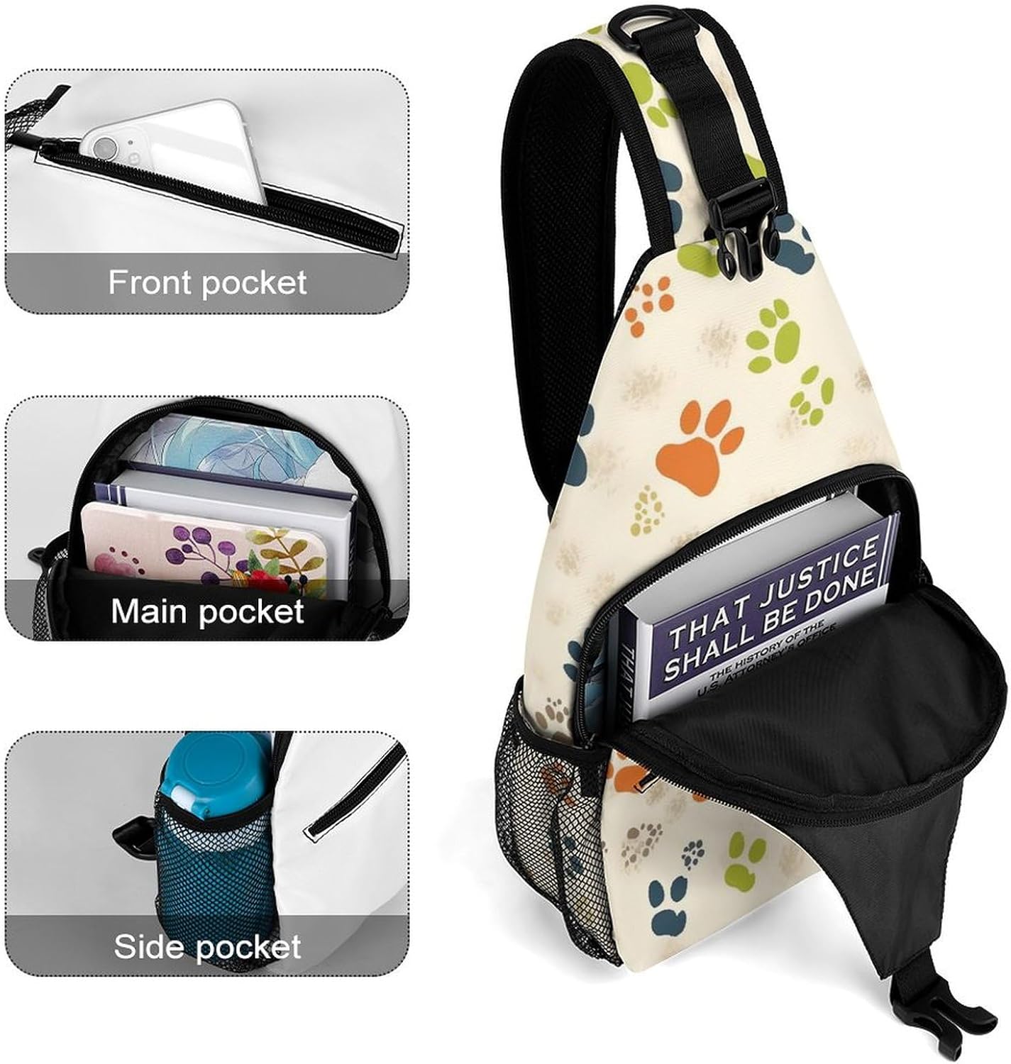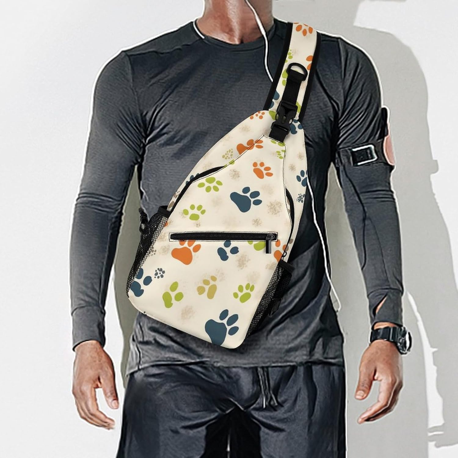 Size: Cat Or Dog Footprints Small sling bag for men size 8 x 4 x 15 inches. The front zipper bag and buckle bag allow you to store iPad, phone, power band, etc, with several separate small compartments inside, it can effectively keep your small items like makeup, tissue, keys and so on.
