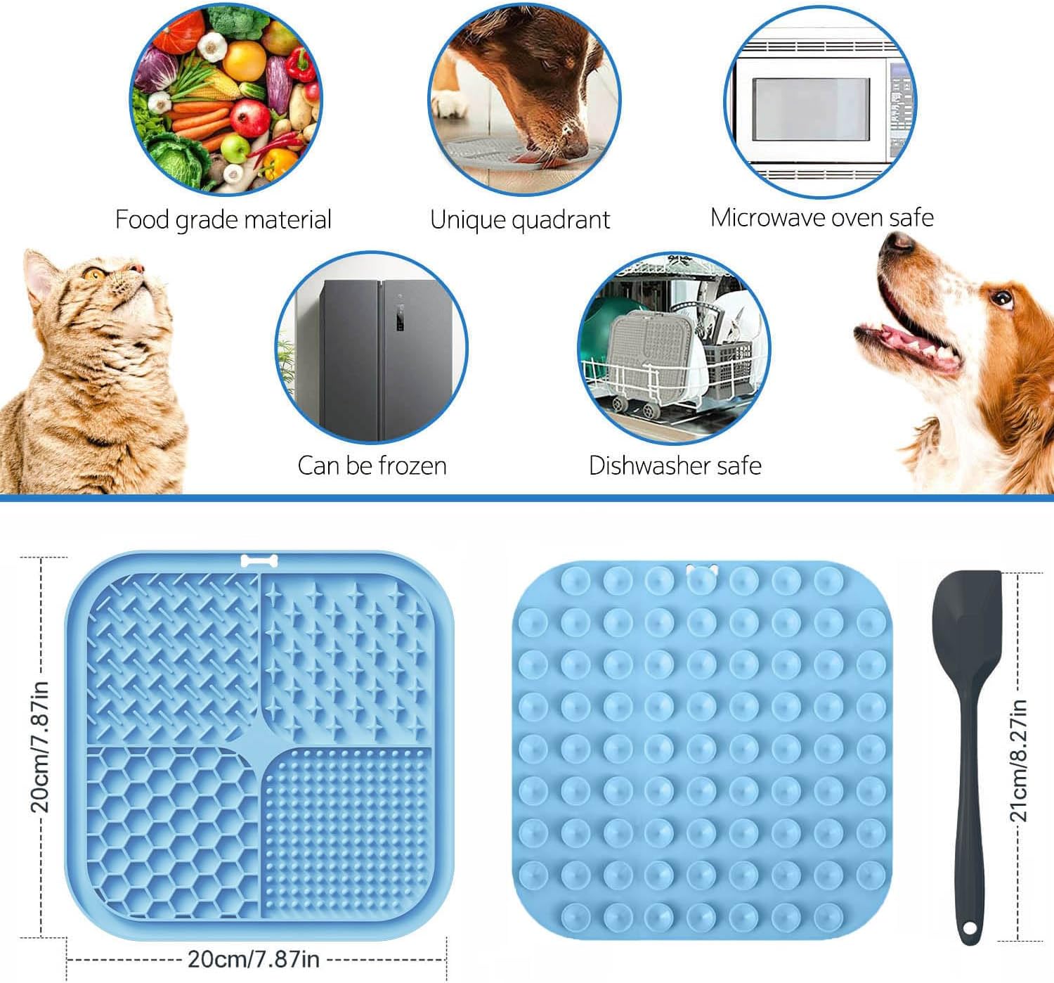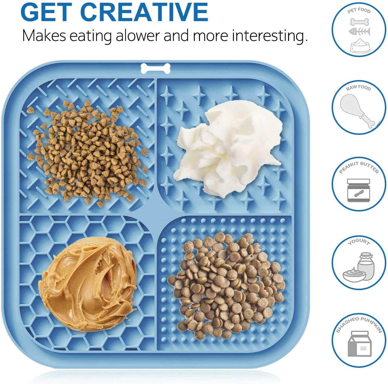 【Slow Feeder Licking Mat for Dogs & Cats】This mat features 4 distinct textured surfaces, perfectly suited for spreadable treats like cream cheese, yogurt, peanut butter, and more. It’s a peanut butter slow feeder mat designed to prolong feeding time and support better digestion for dogs. This licking mat is also ideally sized for cats, puppies, and dogs of all sizes—small, medium, and large