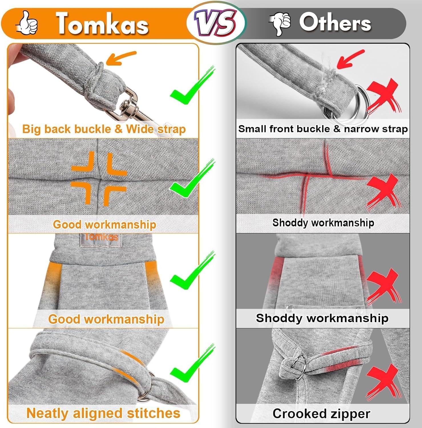 Premium Materials And Design: The TOMKAS puppy carrier is made from selected fabric. The fabric is thick enough to ensure softness and reassure furry children.Hardware and snaps are durable.TOMKAS dog carrier has a large opening that can easily put pets in it.You can move the safety belt to change the bag’s capacity, and press on the snaps to help close the opening.The sutures are tough, well-made and not prone to cracking. TOMKAS dog bags are great chihuahua and Yorkshire accessories.