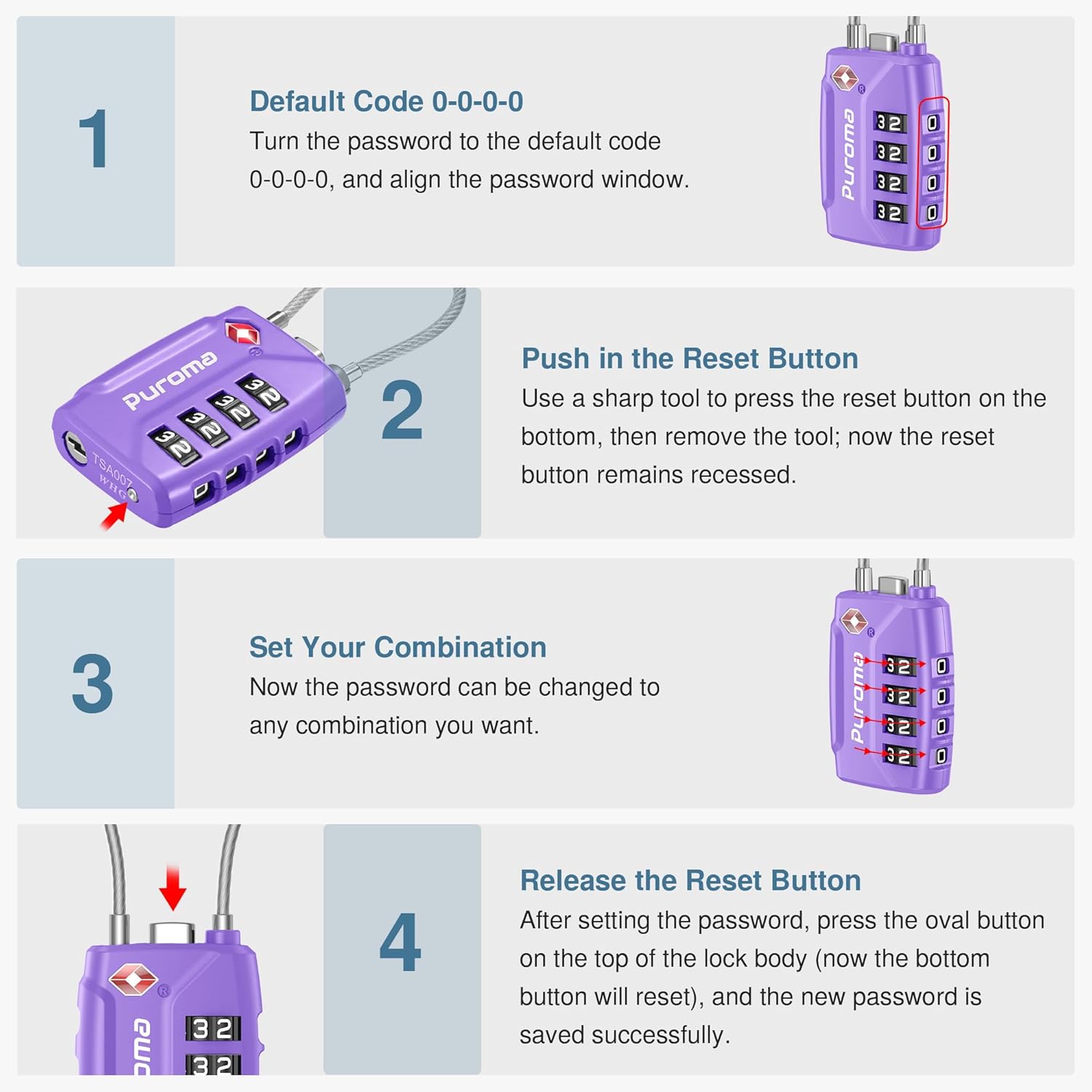 Enhanced Security: Puroma luggage lock offers a 4-digit combination that provides 10,000 unique possibilities, making it significantly more secure than normal 3-digit locks. The white numerals on the black dials make it easy to read your code, even in low light conditions.