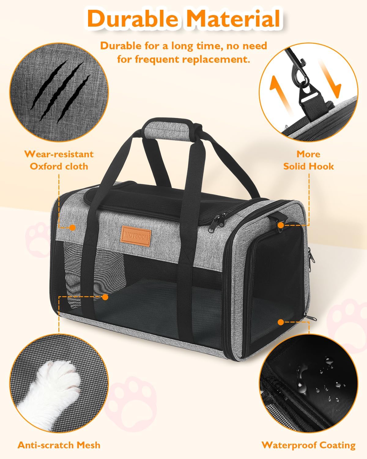 MORE BREATHABLE AND COMFORTABLE: With breathable mesh panels on 3 sides, the PETUX cat travel carrier promotes proper airflow to keep your pet cool and comfortable. The double-sided cushion design ensures your cat’s comfort during long journeys, which allows your pet to rest and relax throughout the flight or car ride. The airline approved pet carrier’s thoughtful structure ensures your pet’s comfort