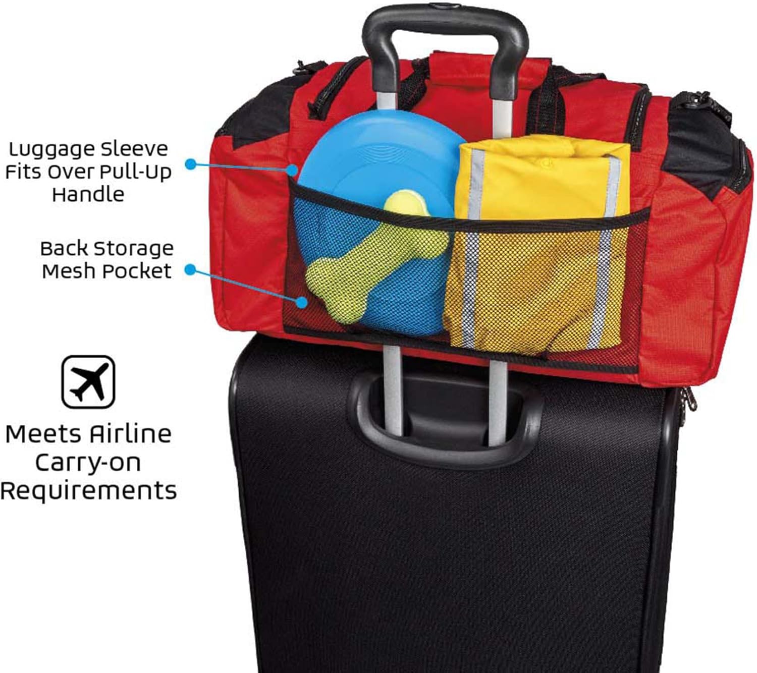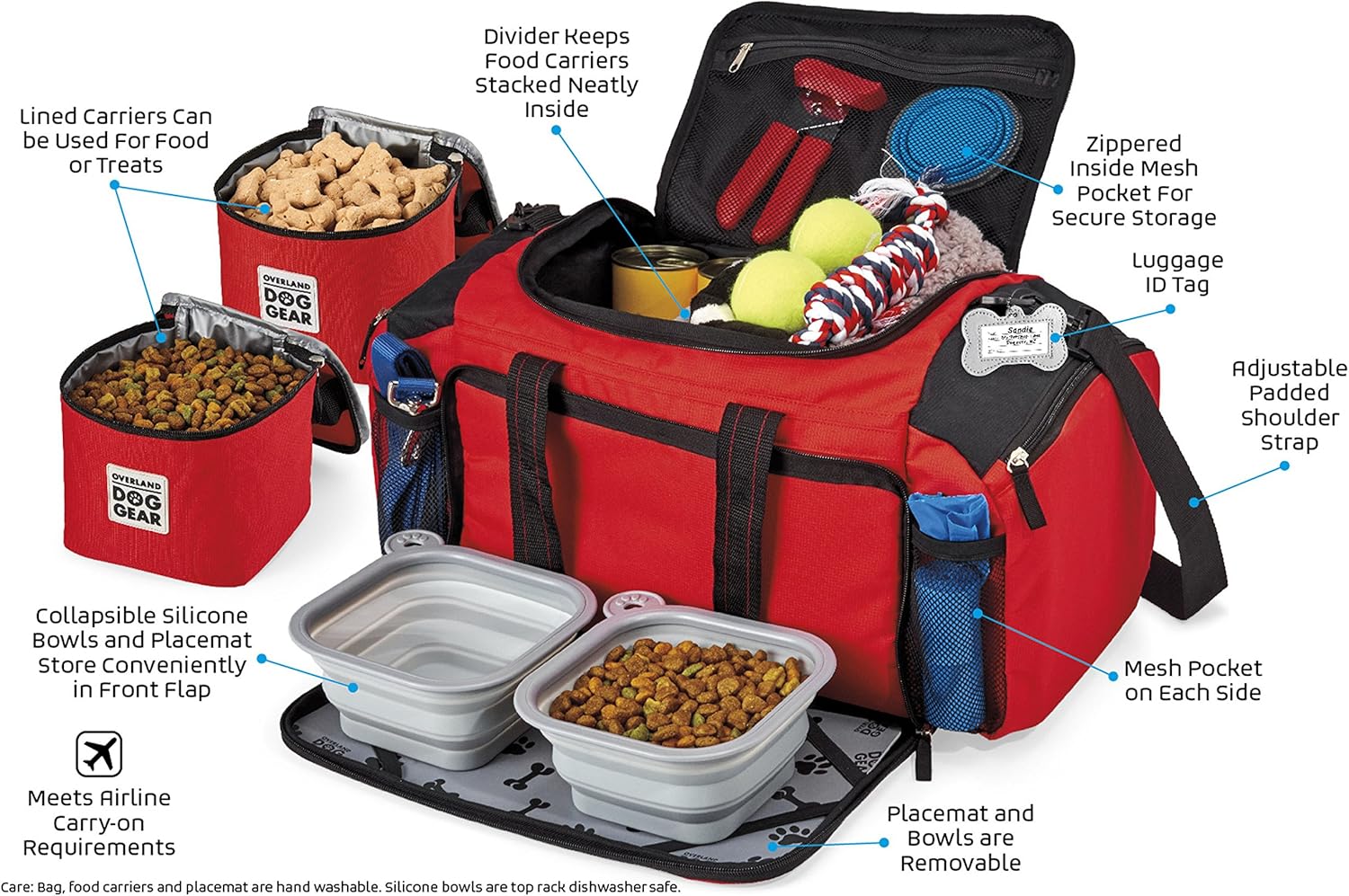 Makes it simple to travel with your dog for up to a week away. This bag meets airline carry-on requirements and even includes a luggage ID tag. Includes two 2 cup collapsible dishwasher safe silicone bowls and placemat as well as two lined carriers to store 10 cups of dog food or treats. Bag also has a zippered inside pocket for secure storage, a divider to keep food carriers stacked neatly, an adjustable shoulder strap and more. Easily rests through a suitcase’s pull-up handle with the attached luggage sleeve.