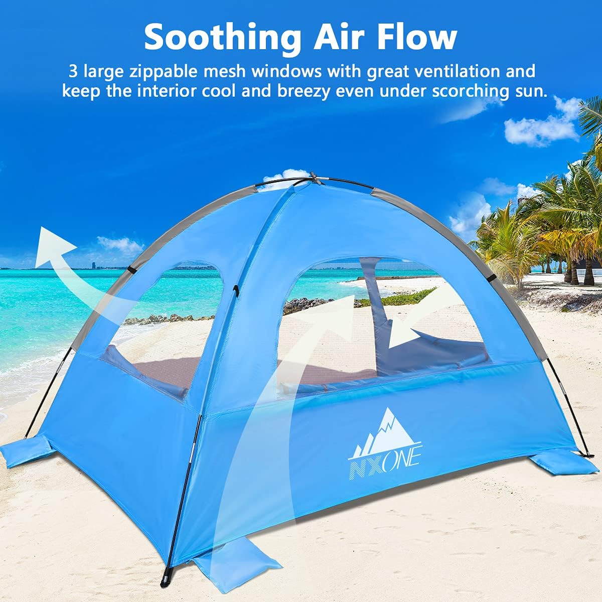 Outdoor Activities Protection & Great Ventilation – Premium 210D sun-proof materials, with embedded coated polyester lining within, are able provide great UV protection (UPF 50+) and reflect or block up to 98% of unhealthy UV rays. The 3 large mesh windows provide excellent airflow to keep the tent nice and chill inside. So you can feel the breeze from the ocean, stay cool in the summer heat wave, and enjoy a comfortable and cozy sun shelter with your family and friends.