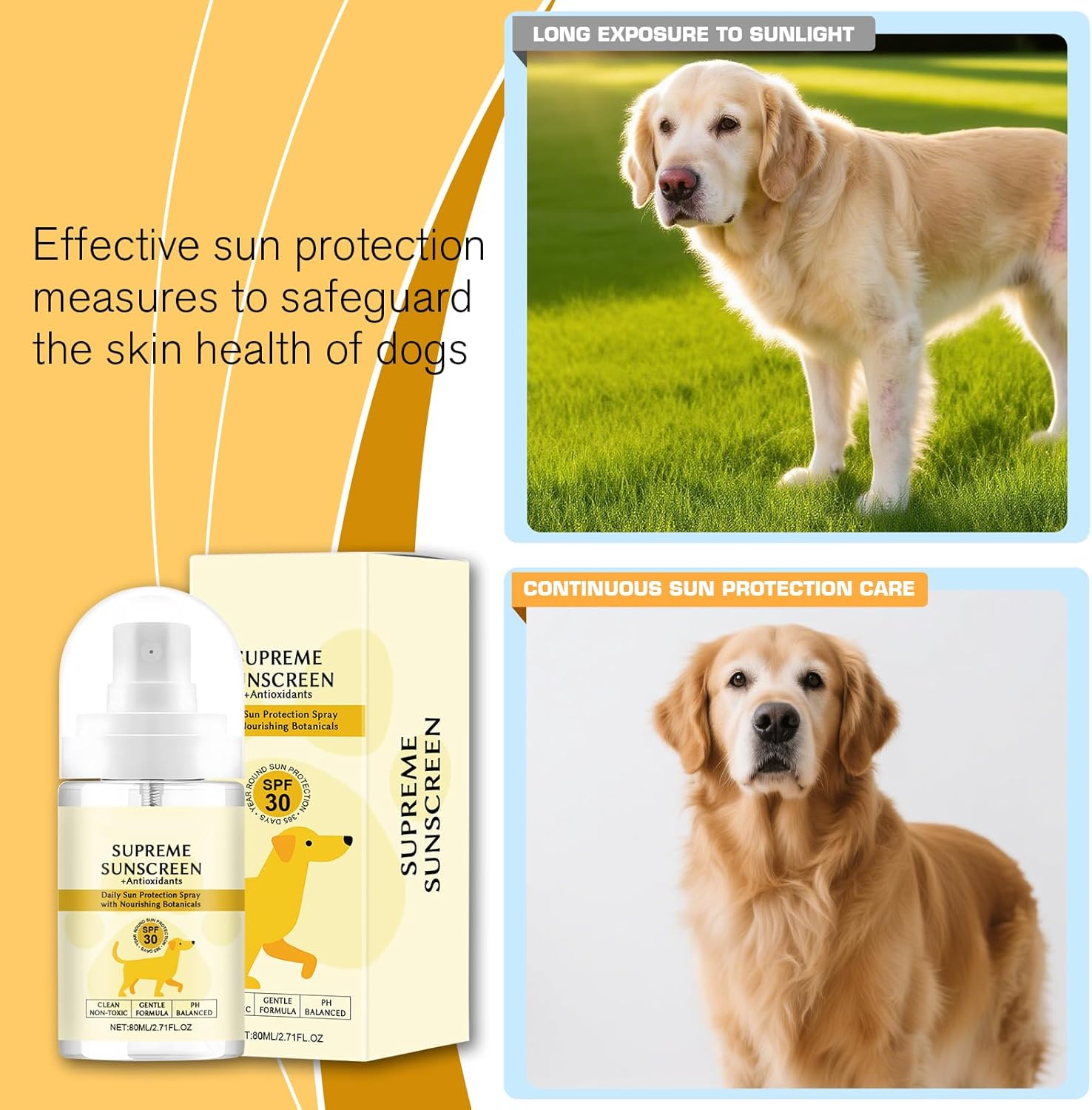 Easy to Use: Before outdoor activities, gently spray the sunscreen on your dog’s sensitive areas, such as the ears and paws. Do not spray the sunscreen into your dog’s eyes or mouth. If necessary, reapply to maintain sun protection