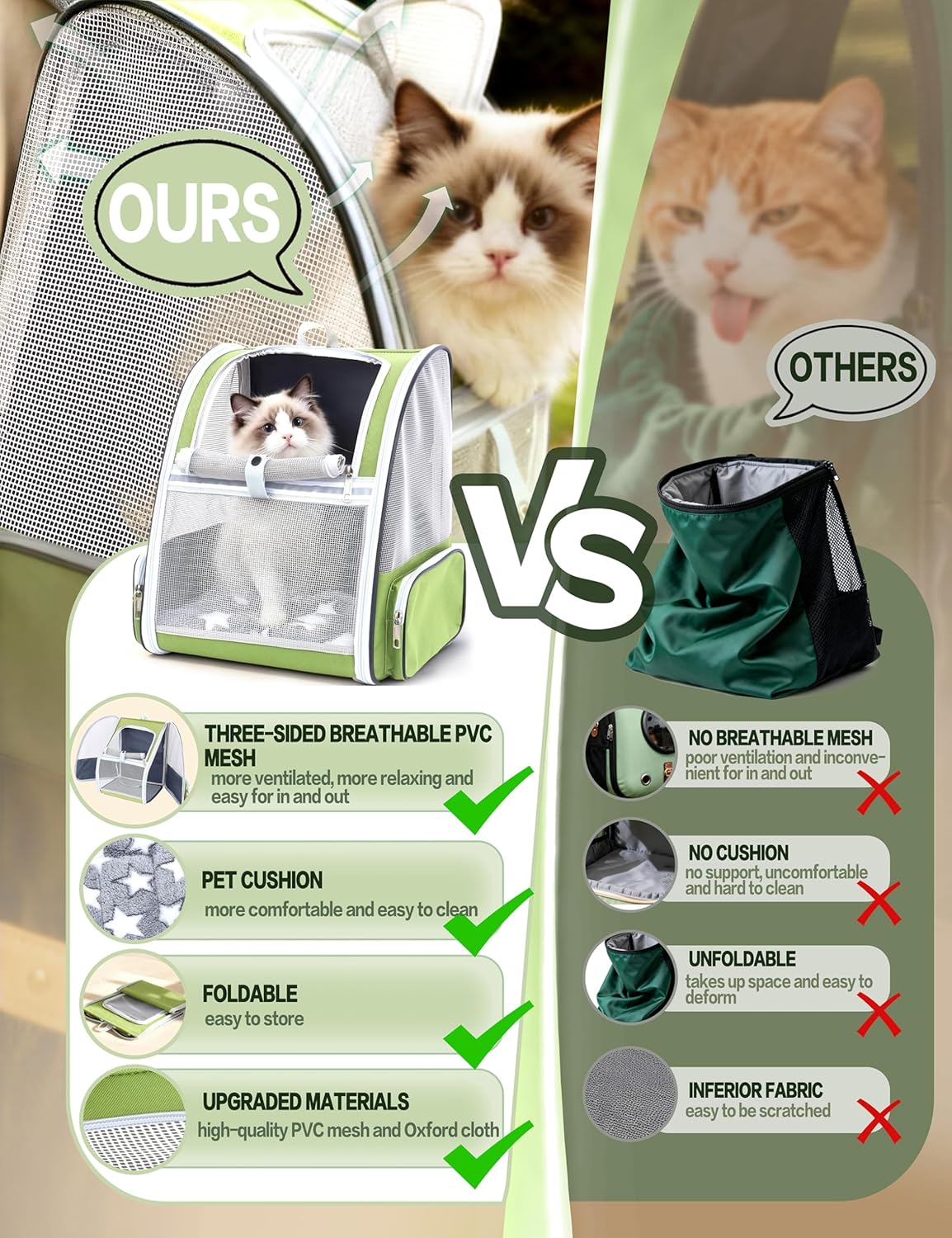 Durable and Convenient Cat Carrier Backpacks : The large cat backpack carrier is highly scratch-resistant and sturdy, designed for long-lasting durability. The side pockets are perfect for storing cat treats or your personal belongings. Featuring three entrances—two side doors and a top window—the cat travel bag makes getting in and out extremely convenient