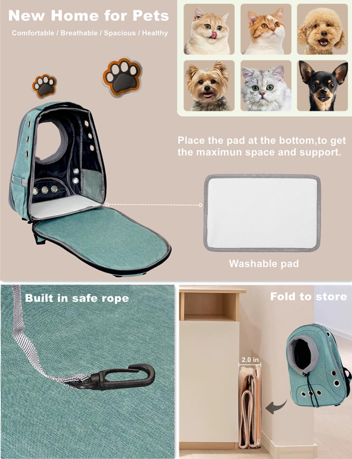 Pet mobile safe house: Includes back and side storage pockets for carrying pet essentials, snacks, leashes, waste bags, or medical records. The pet backpack is foldable for easy storage—when folded, it becomes slim enough to fit into a drawer, saving space. Comfortable and soft padding brings a good outing experience for pets. The padding can be removed for machine washing easly.
