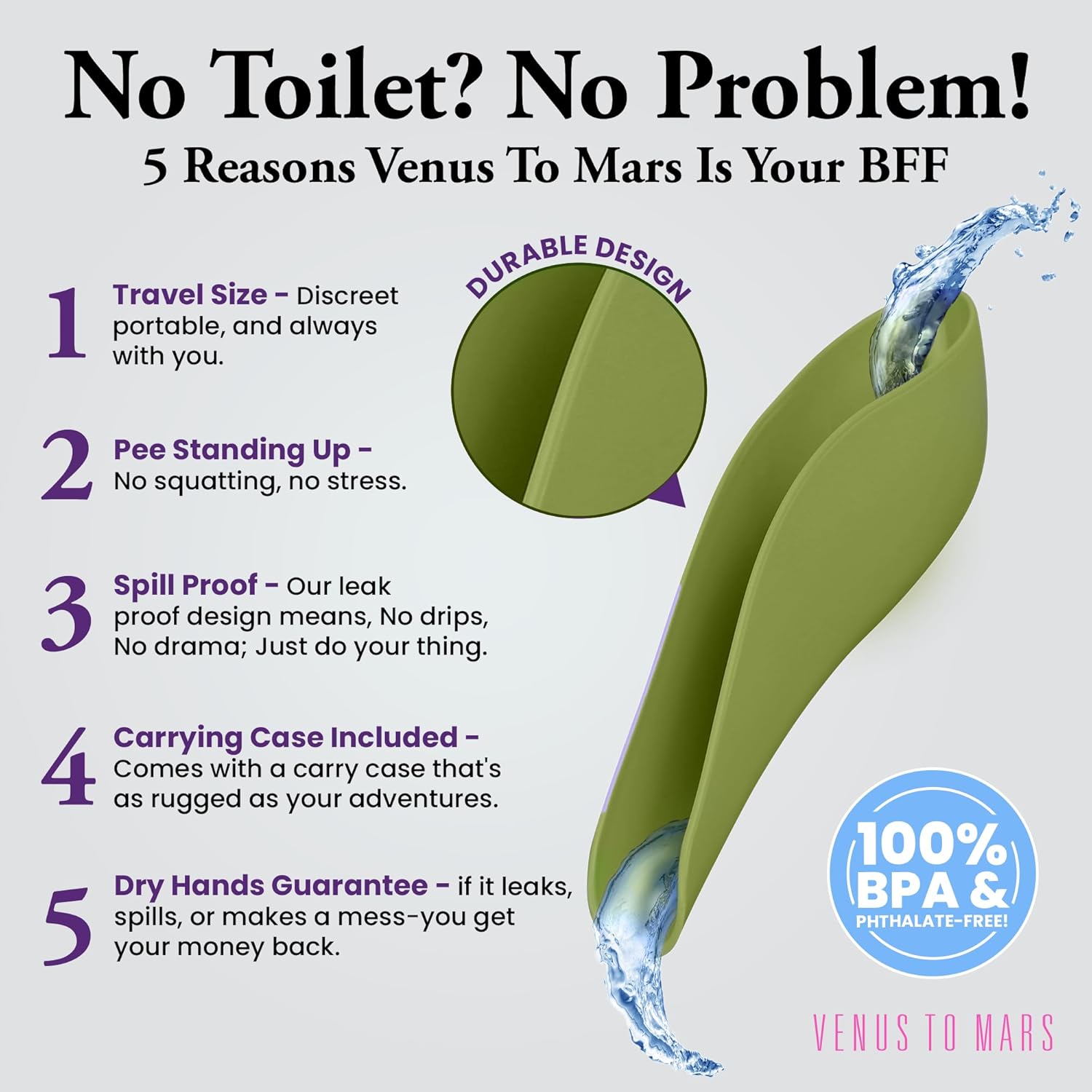 Don’t You Just Hate Having To Worry About Where You’re Going To Pee When You Are Out Of The House? WORRY NO MORE! The Venus to Mars Female Urination Device, sometimes called FUD for short, was specially designed to allow you to pee while standing up anywhere and anytime without having to think about dirty, crowded, or non-existent bathrooms. Our discreet and portable pee funnel is ideal for traveling, road trips, traffic, flying, festivals, camping, hiking, backpacking, sports, and other outdoor activities. Travel freely without worrying about bladder control and incontinence issues. No more squatting or crouching to pee, TAKE A STAND WITH VENUS TO MARS! Why Choose VENUS TO MARS? Superior Design – We made our Pee Funnel with you in mind, that is why we designed it to be able to be used while you’re dressed; NO more dropping your pants! On top of that we used strong and durable plastic to make sure there is no spillage. Easy To Use – The Venus To Mars Female Urination Device was designed to be easy to use so girls of all ages can TAKE A STAND! Simply follow the Complete How To Guide to quickly learn how to properly use the device. Easy To Clean And Reusable – Cleaning the female urination device is as easy as shaking it vigorously or rinse with soap and water when at Home for a deeper clean. You can even clean it in the dishwasher or washing machine Easy To Store – Our Female Urinal is the ideal size to discreetly place in your bag, purse, backpack, or glove compartment. It even comes with a = carrying case and a carabiner to clip to your bag, purse, or backpack.