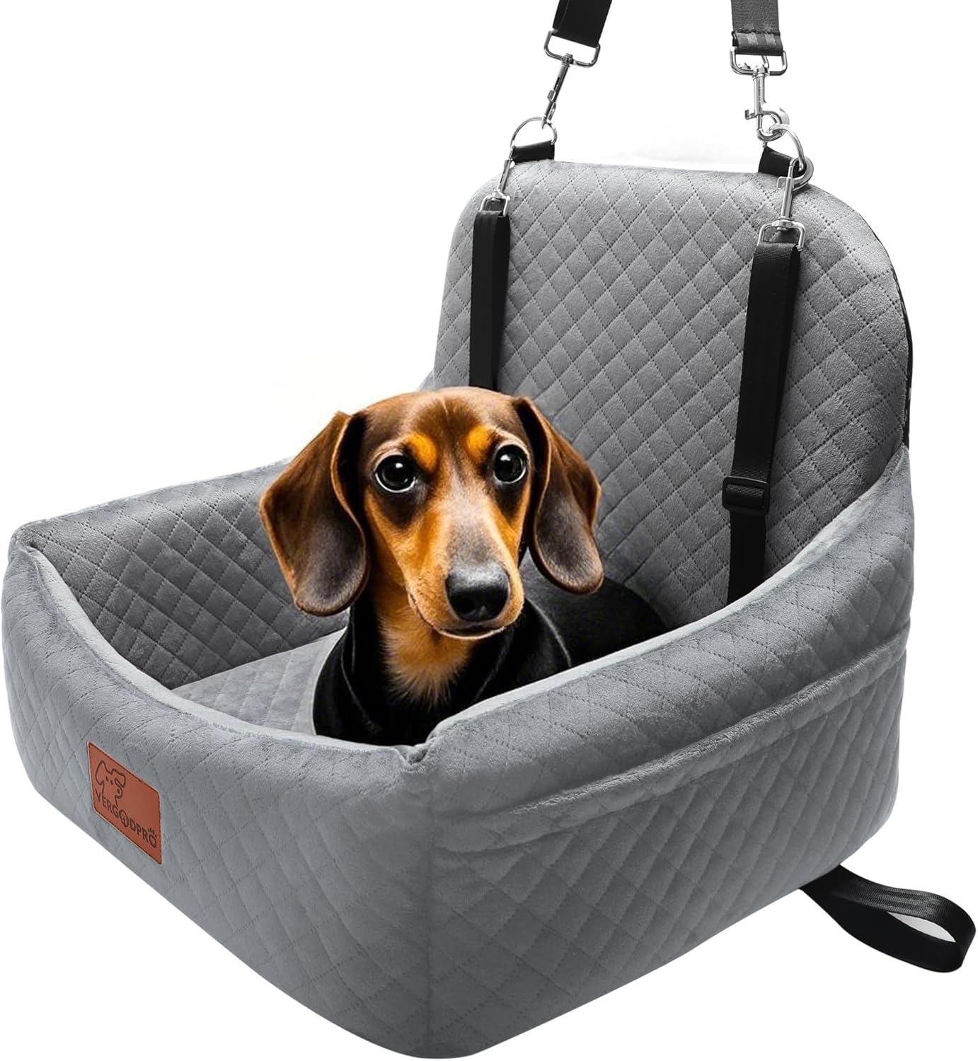 Security:VERGODPRO dog car seat is made of high-rebound memory foam and soft fabric.The material that comes into contact with the bottom and back of the car seat is an anti-slip material with dog paw prints,which increases the friction between the dog car seat and the car seat during driving,After installation,it’s not easy to move. The travel dog car beds equipped with 2 pet buckle safety belts and 1 car headrest safety belt.