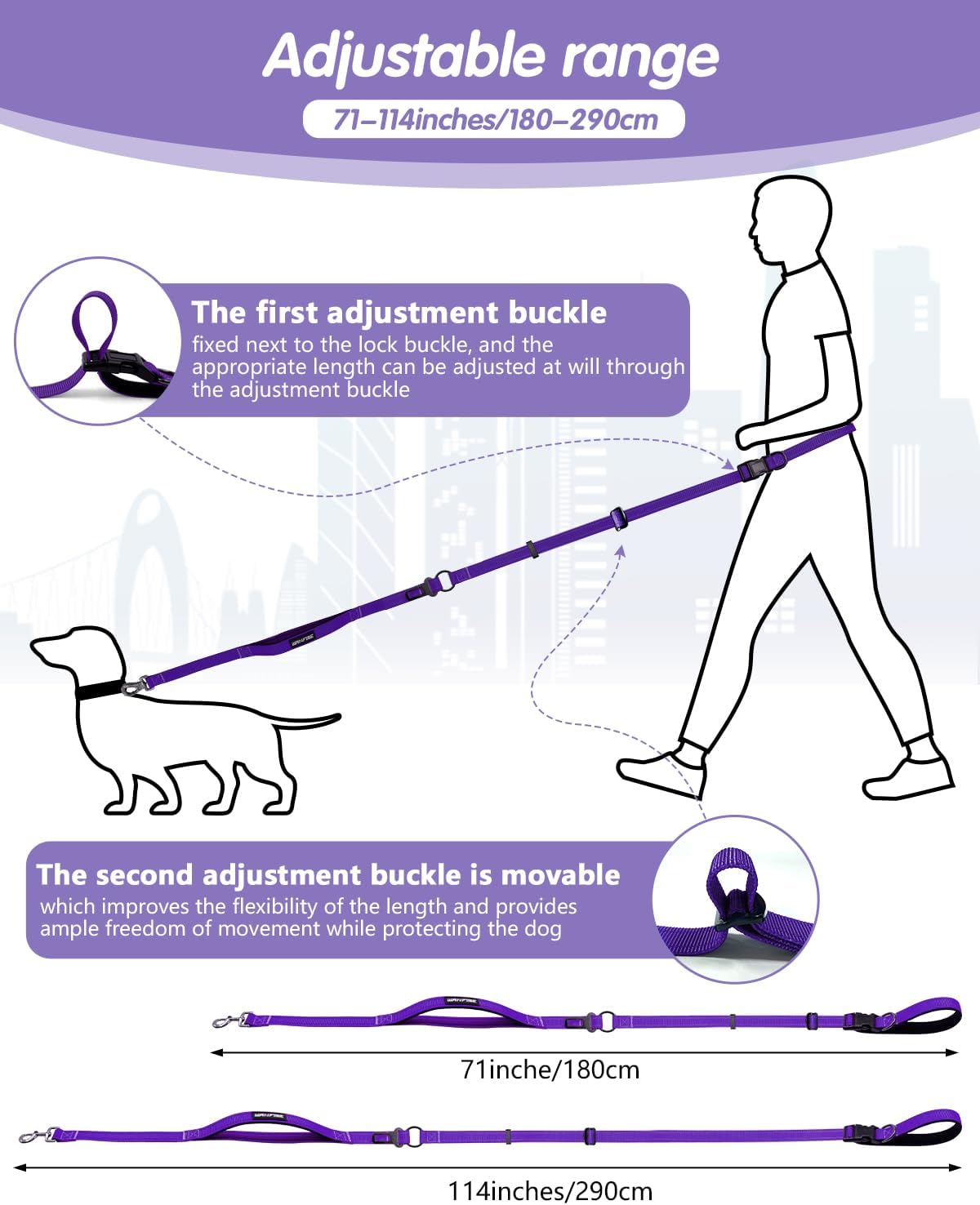 🦮【2 in 1 Hands Free Dog Leash with Car Seatbelt】The dog leash has a length range of 5.9ft – 9.5ft and includes two adjustment buckles to customize the length as needed. The leash can be adjusted in length as a “shoulder strap, waist belt or handheld leash”. Flexible adjustment can enhance various interactions between you and your pet. (This length of this product is suitable for medium and large dogs, please confirm before purchasing)