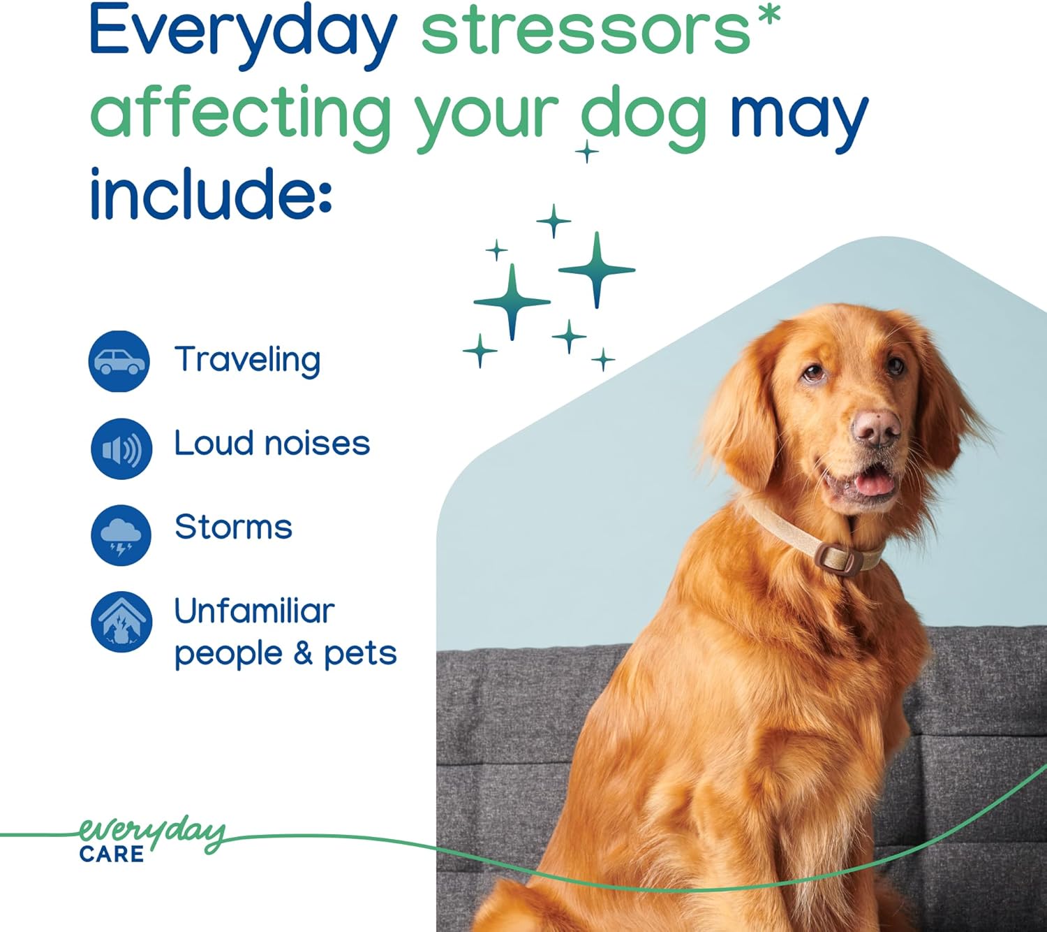 Helps With Common Stressors – Help your dog stay calm when dealing with loud noises, visits to the vet or groomer, travel, unfamiliar people, animals, changes in routine and other stressful situations.
