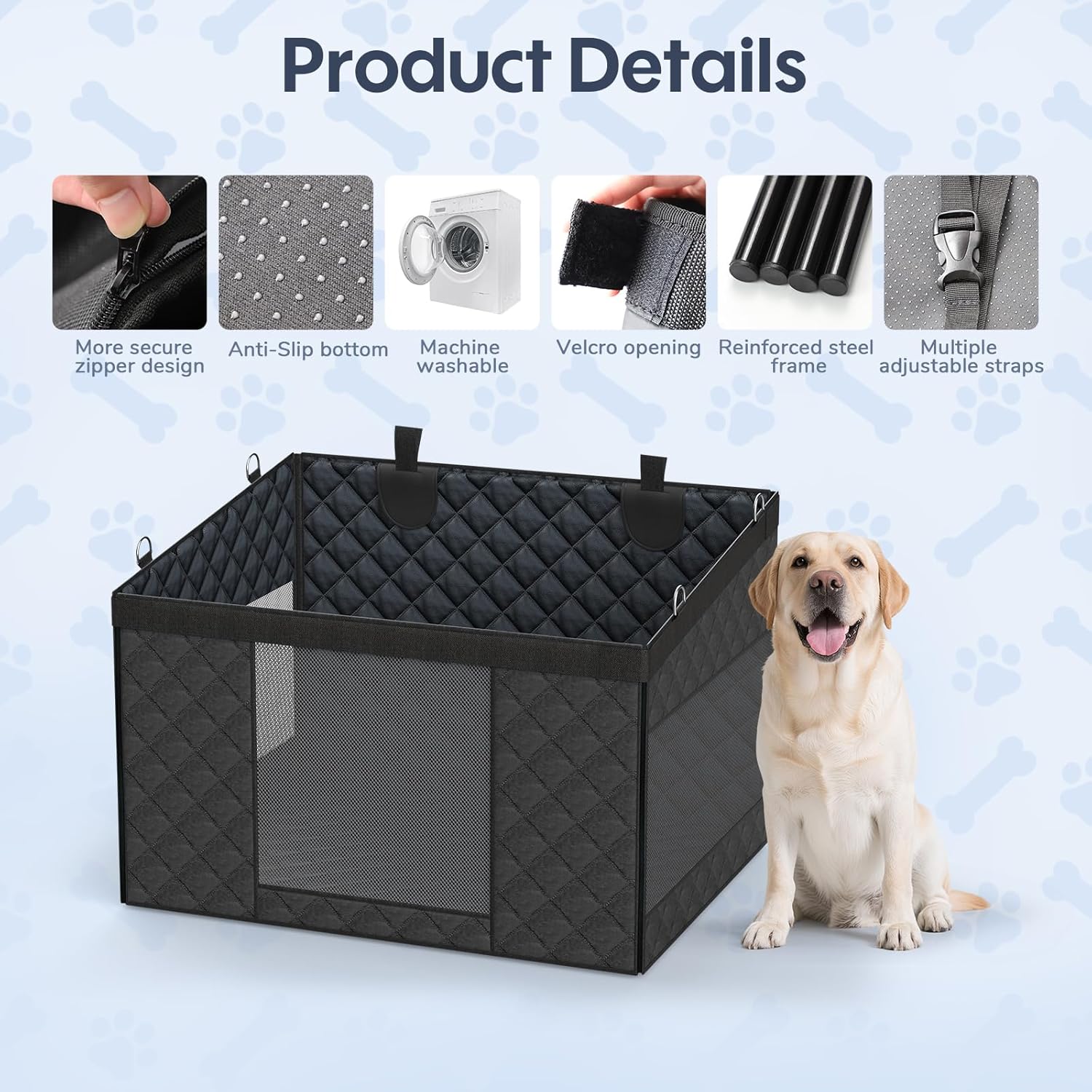 【All-round Protection For Dog Safety】The dog seat cover for back seat features four reinforced plates at the bottom and metal connectors around the edges to make the seat sturdier. This design helps prevent your dog from falling in the event of a sudden stop, offering crucial protection. An additional safety belt is included to secure your dog in case your dog walks around or falls off the big dog car seat