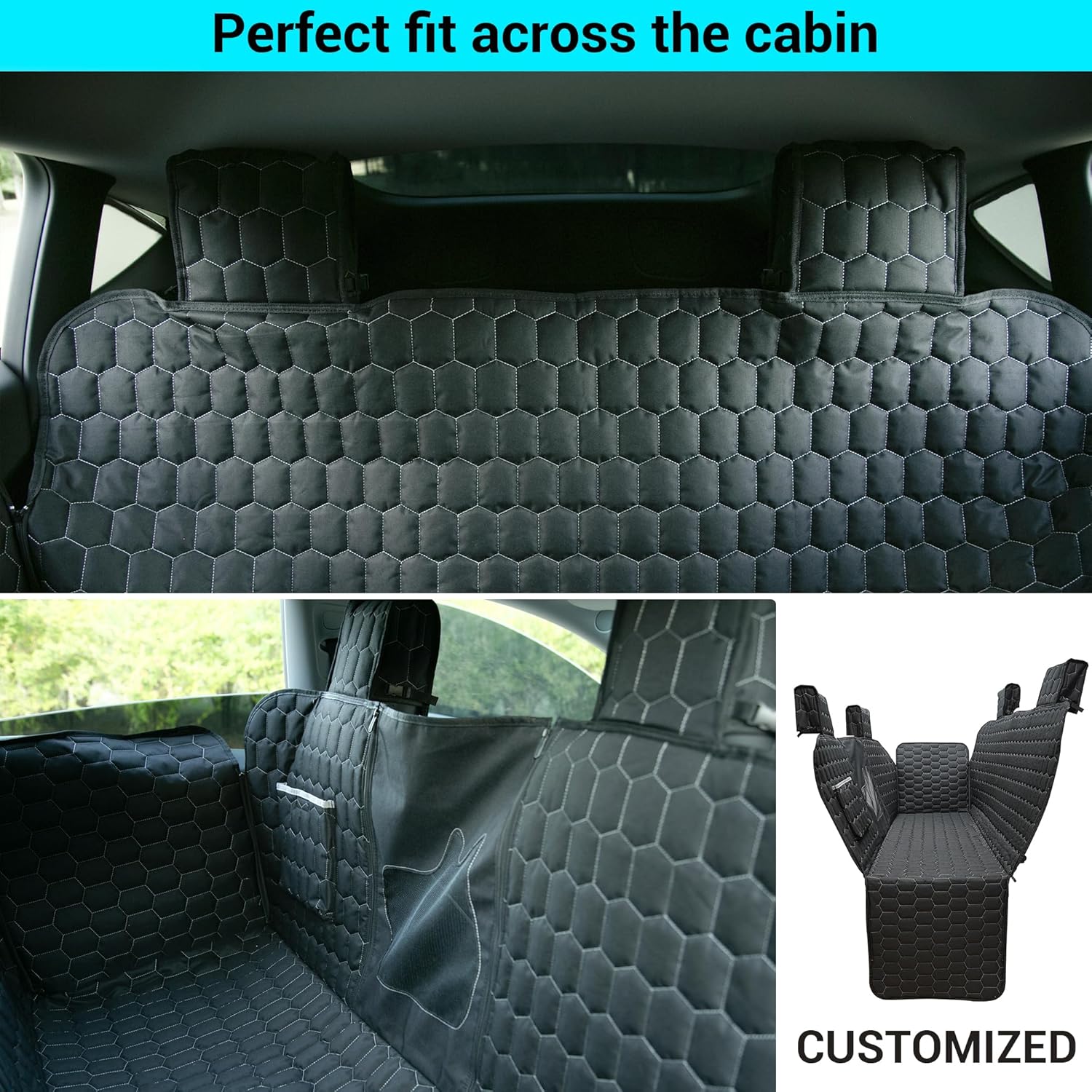 【Headrest Design】The design of our pet seat cover solves the troubles of Tesla without armrest on the roof. Our dog car seat cover adopts an all-inclusive headrest design and comes with a retractable buckle, which is accurate in size, integrated interior, luxury and beautiful.