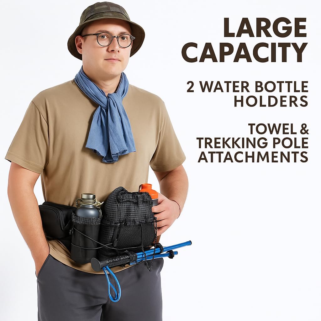 【Adjustable Waist Belt】Hiking waist pack with water bottle with adjustable waist belt,allowing users to customize the waist pack,It can be adjusted to a comfortable and suitable size according to your waist circumference, allowing you to reduce the feeling of weight and discomfort,sturdy buckle makes it easy to take on and off.