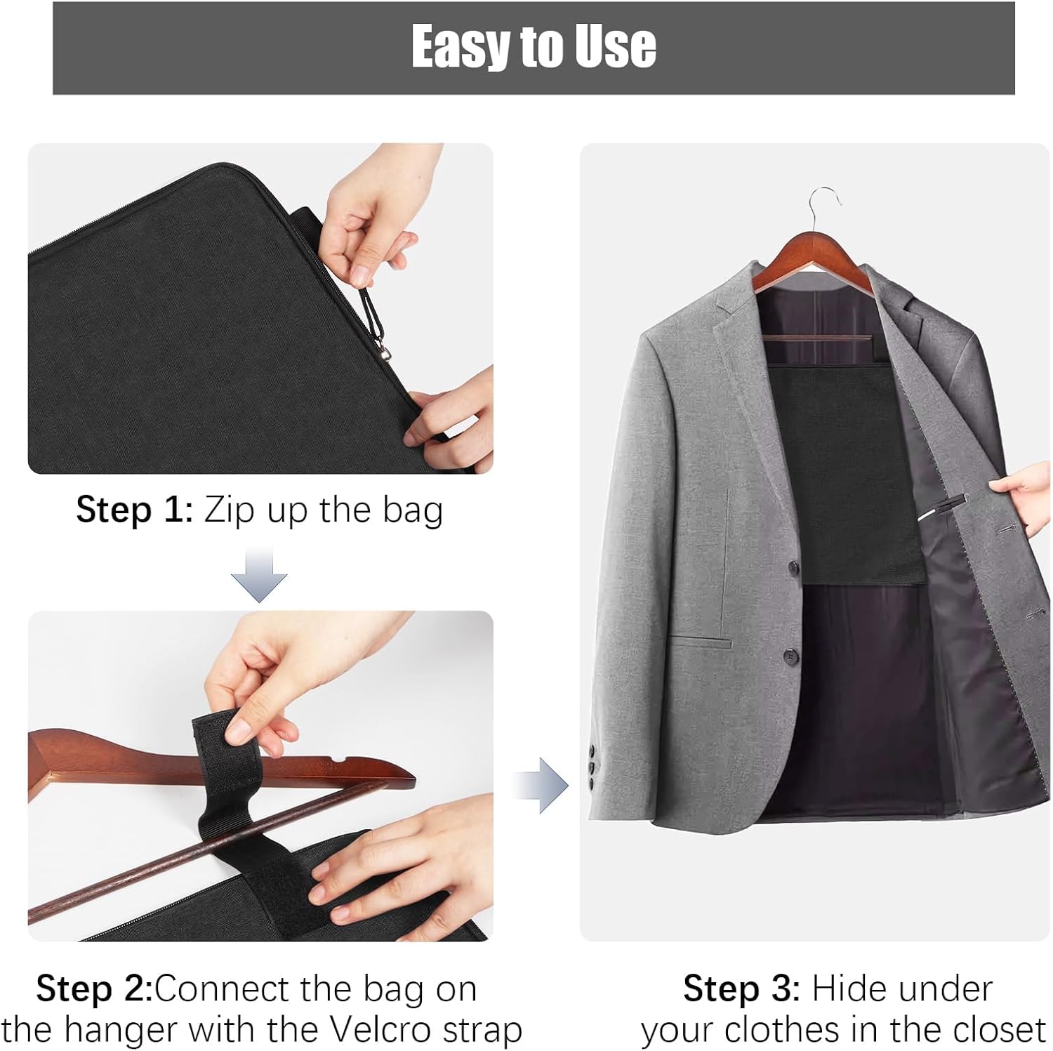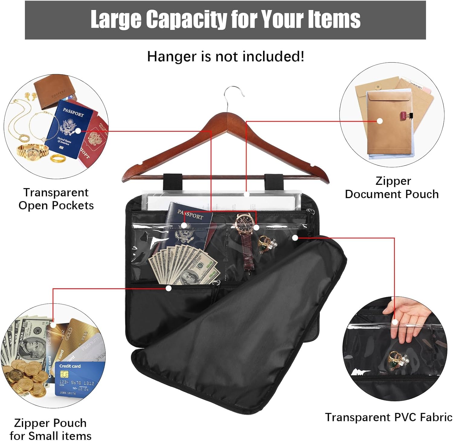 ✔ Large capacity & fit all clothes hangers: The Adjustable Velcro Straps fit all kinds of Hangers. One large zipper pocket for your important documents, 2 clear PVC open pockets and one zipper pocket, which can storage most of your cash, cards, passports, documents, jewlery, etc. (clothes hanger is not included)