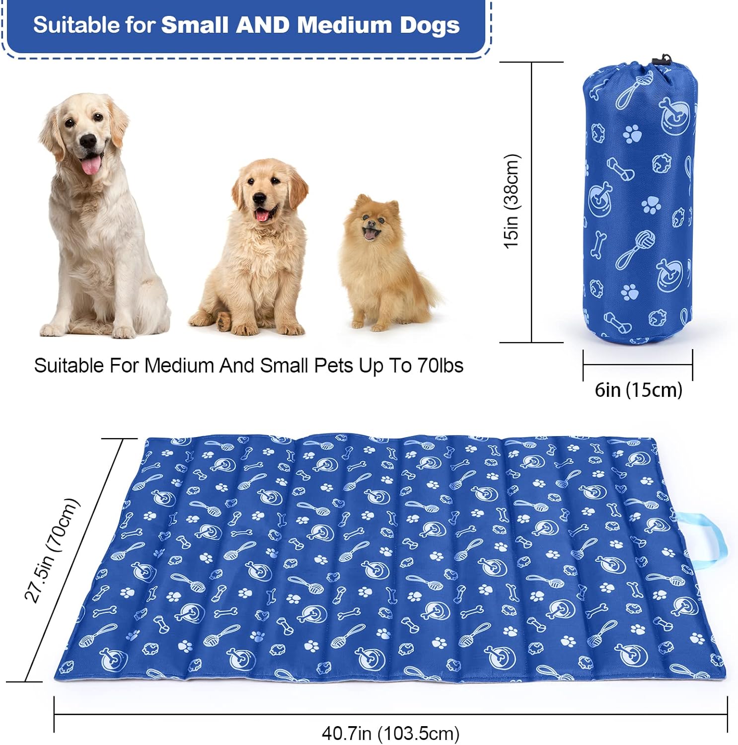 DIMENSION: The product size is 40.7 inches by 27.5 inches(103.5cm by70cm). The size of the storage bag is 15 inches by 6 inches by 6 inches (38cm by 15cm by 15cm) when holding the dog bed. Please note that all of these measurements are taken manually and may have minor errors. It is fit for small and medium-sized dogs that weigh less than 70 pounds.