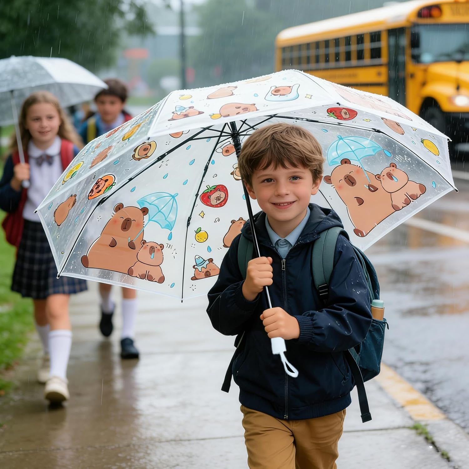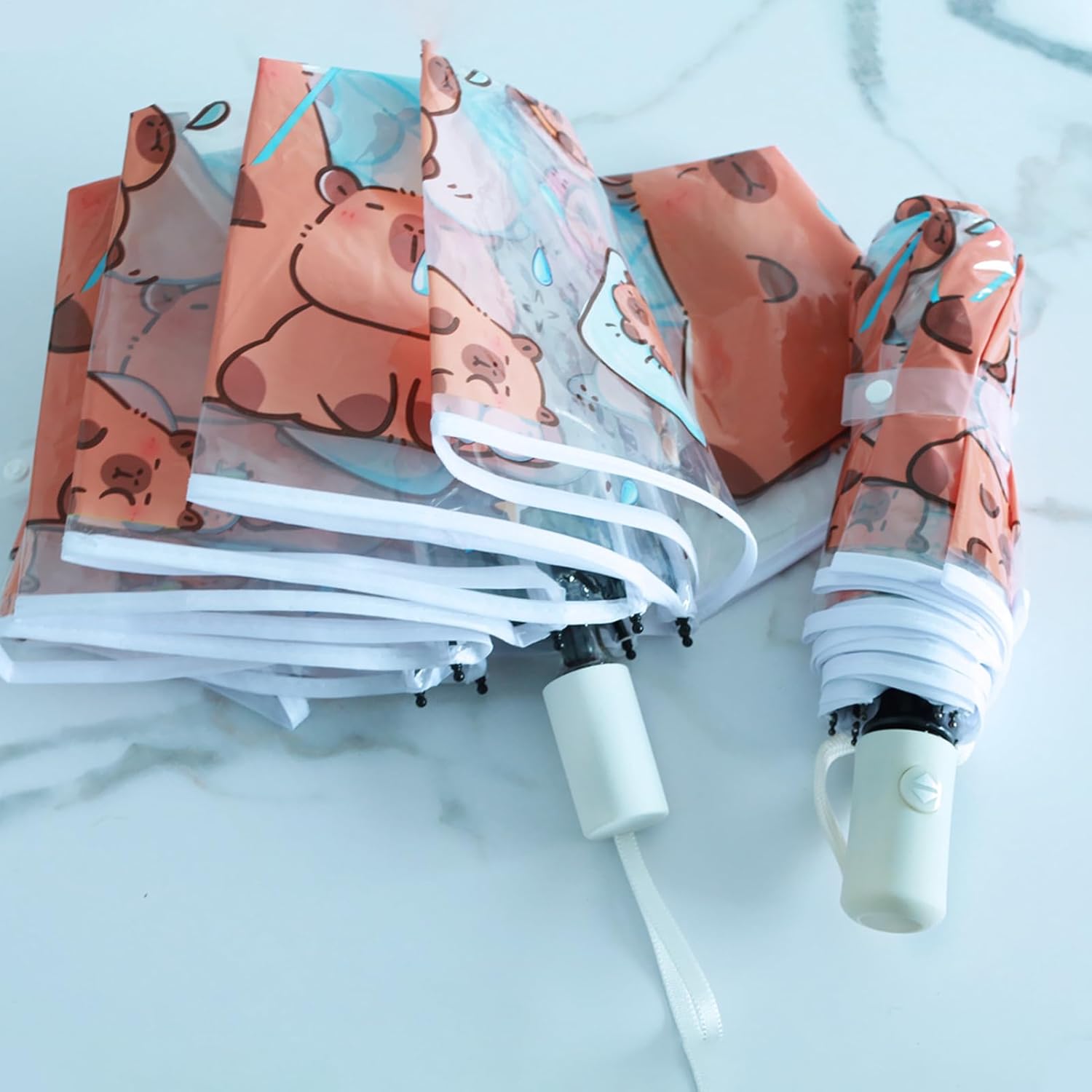 The mini kids umbrella is a delightful and practical tool designed for children who love outdoor activities in the rain. Featuring a cute capybara design, this lightweight umbrella captures the hearts of boys and girls alike while offering reliable waterproof protection. Its quick-dry fabric ensures convenience during travel, camping, or school commutes, making it an ideal companion for family trips and adventures with friends. Compact and easy to carry, this umbrella serves as a thoughtful birthday gift that combines functionality with charm. Whether used for daily errands or special occasions, the mini kids umbrella provides dependable coverage and adds joy to rainy days. Designed to meet the needs of active children, it supports exploration in any weather. Specification Specifications: 3 folding automatic Material: PVC, metal Expanded size: about 97x57cm/38.19×22.44 inches Folding size: about 28cm/11.02 inches List kids umbrella x1 Note: 1. Due to lighting effects and display angles, there may be color differences in the product. 2. Due to manual measurement, there may be errors in product size, please understand.