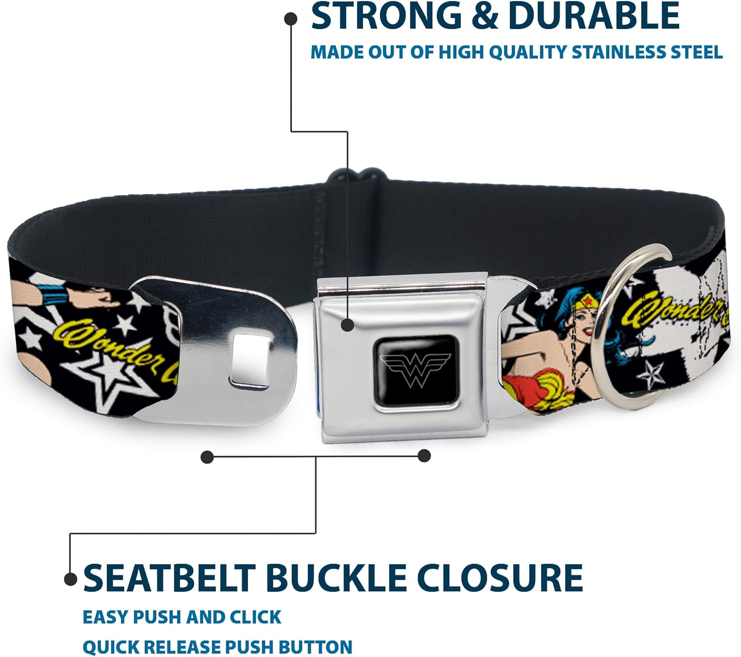 Buckle-Down Seatbelt Buckle Dog Collar – Wonder Woman/Stars Black/White – 1″ Wide – Fits 15-26″ Neck – Large