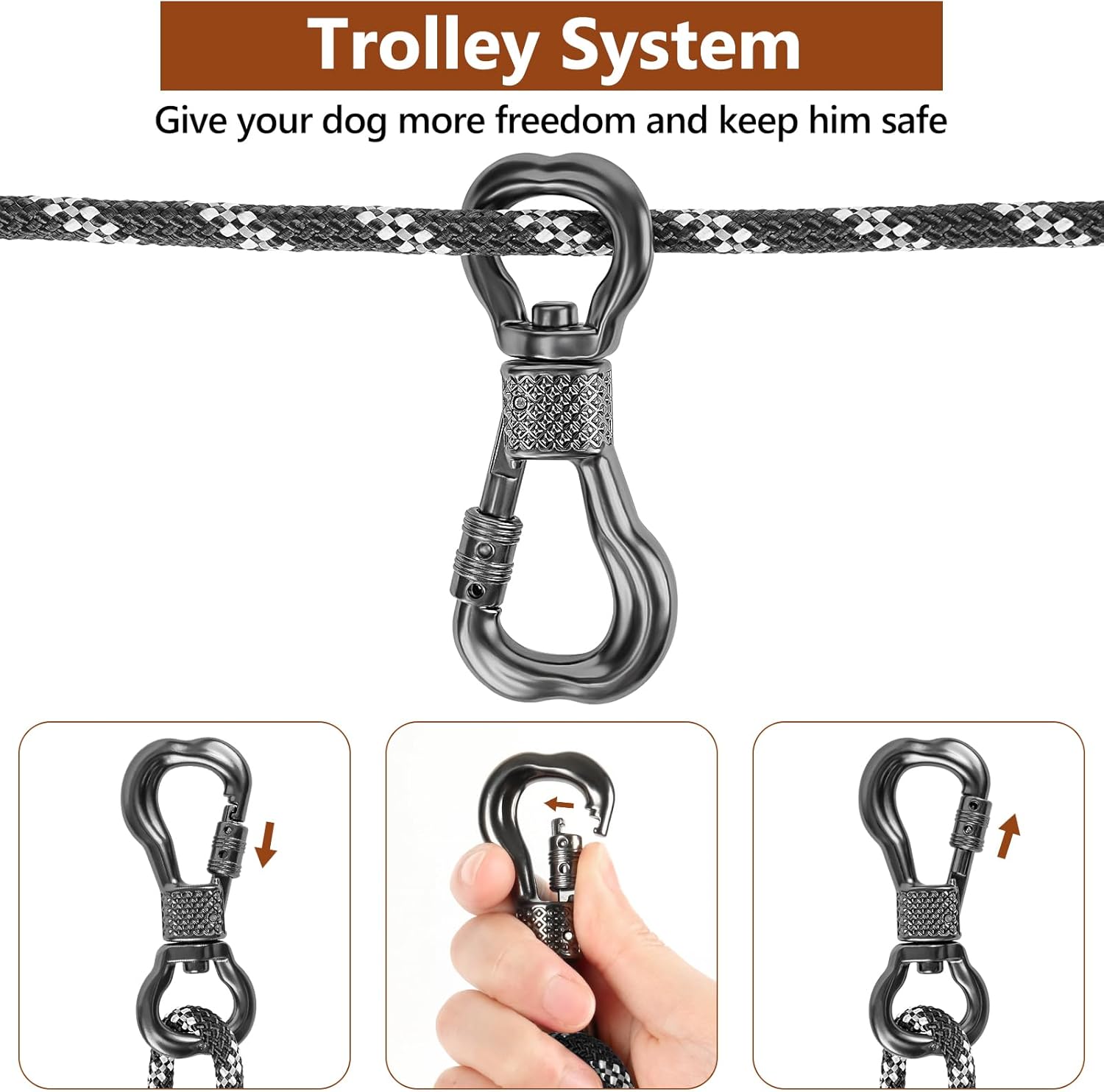 Package Contents: Dog trolley runner includes: 50ft dog cable, 2 steel buckles, 1 360°tangle free clip and instruction sheet. The pictured leash attached to the dog is not included. If you have any questions about product set up, please feel free to contact us, any problems will be resolved in time.