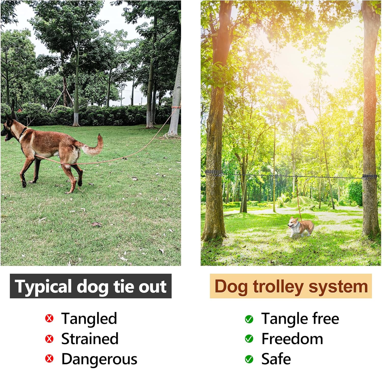 Keep Dog Safe: Compared to typical dog tie out, Dog zip line minimize the chances of your pooch getting strangled or wrapped around trees or picnic tables, and increases your pet’s free roaming range. Glow-in-the-dark, reflective dog line will make sure to improve your dog’s visibility at night.