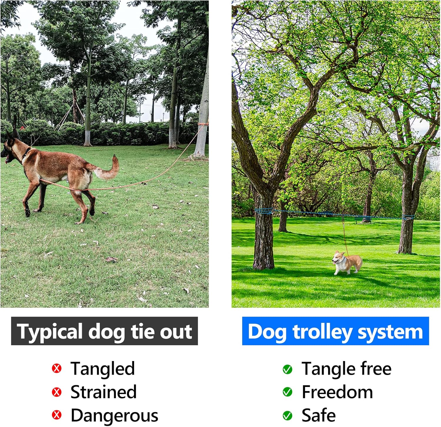 Keep Dog Safe: Compared to typical dog tie out, Dog zip line minimize the chances of your pooch getting strangled or wrapped around trees or picnic tables, and increases your pet’s free roaming range. Glow-in-the-dark, reflective dog line will make sure to improve your dog’s visibility at night.