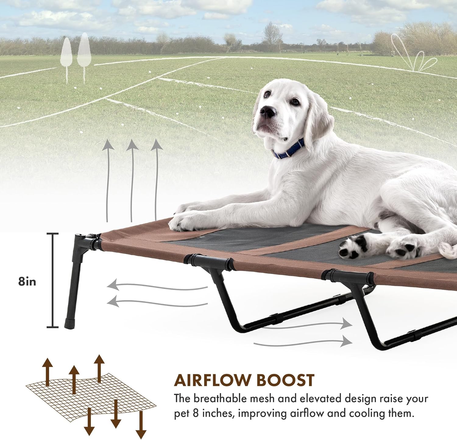 Elevated Cooling Comfort – Keep your furry friend cool and comfy year-round. Raised over 8 inches off the ground, this breathable mesh bed allows refreshing airflow from all sides, preventing heat buildup and keeping your pet dry and off damp or muddy surfaces, no matter the weather.